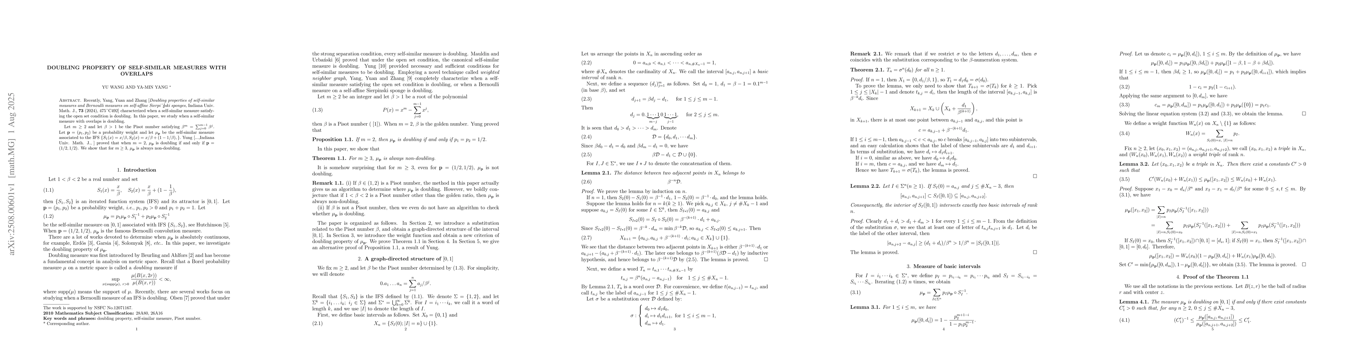 Recently, Yang, Yuan and Zhang [Doubling properties of self-similar measures and Bernoulli measures on self-affine Sierpinski sponges, Indiana Univ. Math. J., 73 (2024), 475-492] characterized when a self-similar measure satisfying the open set condition is doubling. In this paper, we study when a self-similar measure with overlaps is doubling. Let $m\geq 2$ and let $\beta>1$ be the Pisot number satisfying $\beta^m=\sum_{j=0}^{m-1}\beta^j$. Let $\mathbf{p}=(p_1,p_2)$ be a probability weight and let $\mu_{\mathbf{p}}$ be the self-similar measure associated to the IFS $\{ S_1(x)={x}/{\beta}, S_2(x)={x}/{\beta}+(1-{1}/{\beta}),\}.$ Yung [...,Indiana Univ. Math. J., ] proved that when $m=2$, $\mu_{\mathbf{p}}$ is doubling if and only if $\mathbf{p}=(1/2,1/2)$. We show that for $m\geq 3$, $\mu_{\mathbf{p}}$ is always non-doubling.