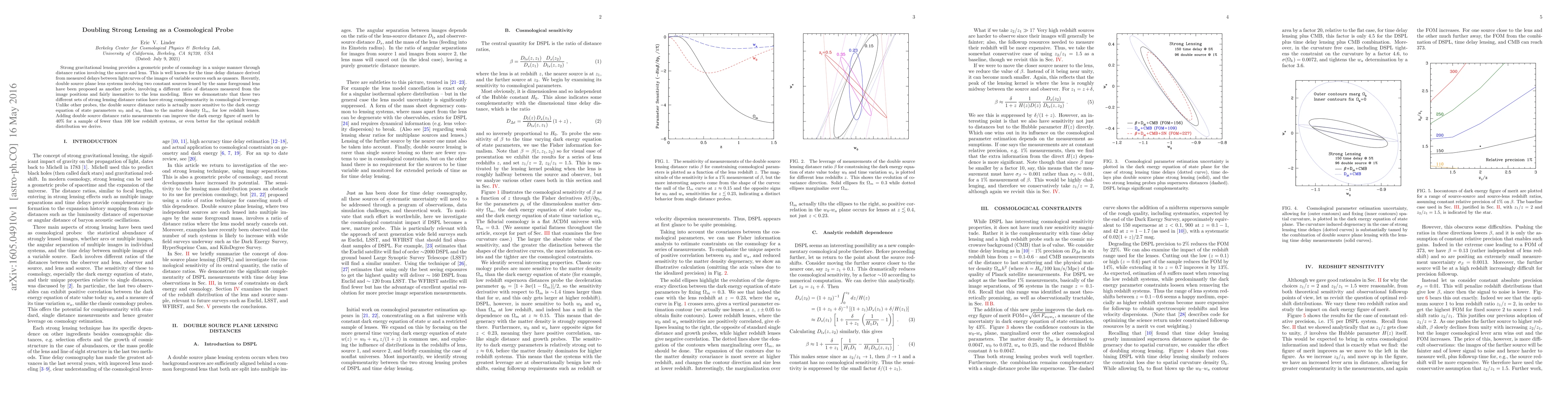 Doublesource planelensing offers a unique combination of advantages, including positive correlation with dark energy equation of state parameters and complementarity with single-distance measures.