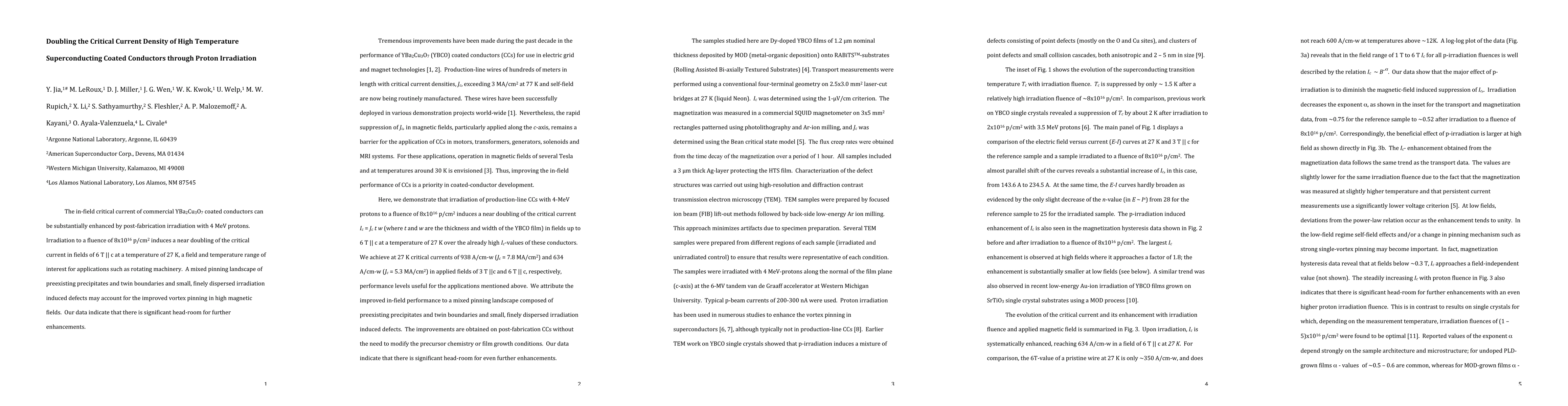 This study demonstrates that proton irradiation can nearly double the critical current density of YBa2Cu3O7 coated conductors, enhancing their performance in high magnetic fields at low temperatures. The irradiation-induced defects and existing structural features likely contribute to improved vortex pinning, suggesting potential for further improvements.