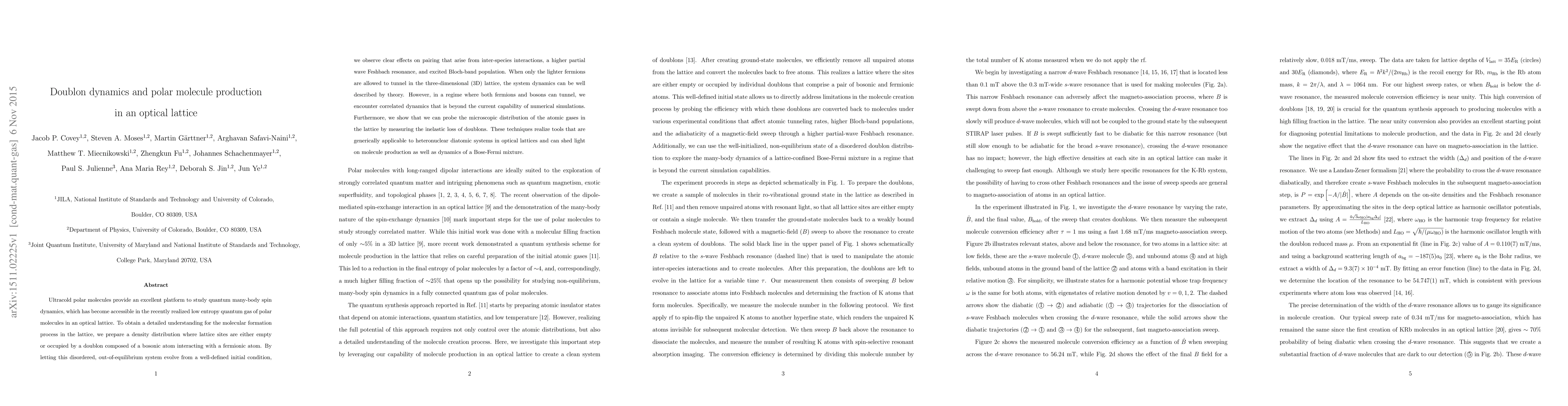 This research investigates the dynamics of doublons and the production of polar molecules in an optical lattice, revealing complex interactions and dynamics in a Bose-Fermi mixture. The study finds that while single-species tunneling dynamics align with theoretical predictions, dual-species tunneling leads to correlated dynamics not fully captured by current simulations, and proposes a method to probe atomic distributions via doublon loss.