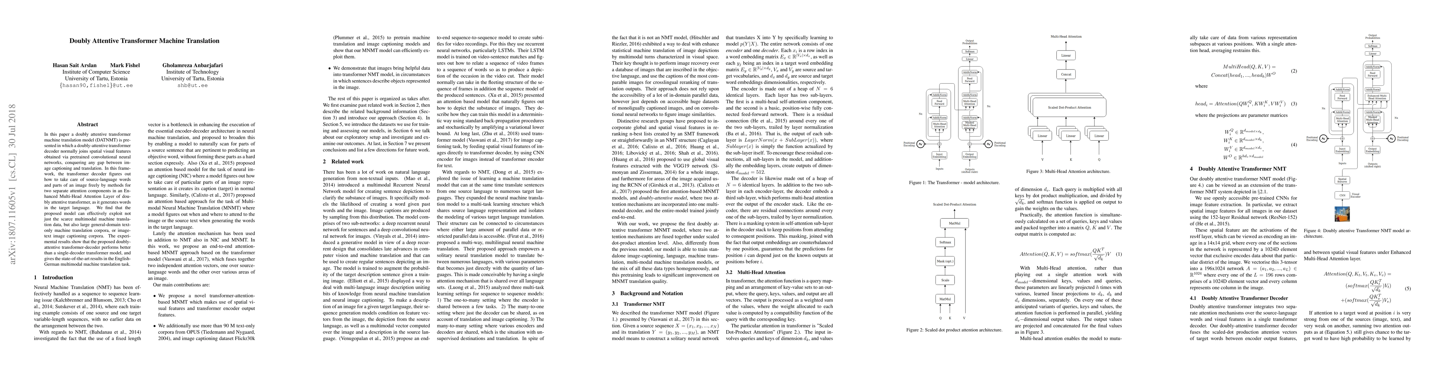 In this paper a doubly attentive transformer machine translation model (DATNMT) is presented in which a doubly-attentive transformer decoder normally joins spatial visual features obtained via pretrained convolutional neural networks, conquering any gap between image captioning and translation. In this framework, the transformer decoder figures out how to take care of source-language words and parts of an image freely by methods for two separate attention components in an Enhanced Multi-Head Attention Layer of doubly attentive transformer, as it generates words in the target language. We find that the proposed model can effectively exploit not just the scarce multimodal machine translation data, but also large general-domain text-only machine translation corpora, or image-text image captioning corpora. The experimental results show that the proposed doubly-attentive transformer-decoder performs better than a single-decoder transformer model, and gives the state-of-the-art results in the English-German multimodal machine translation task.