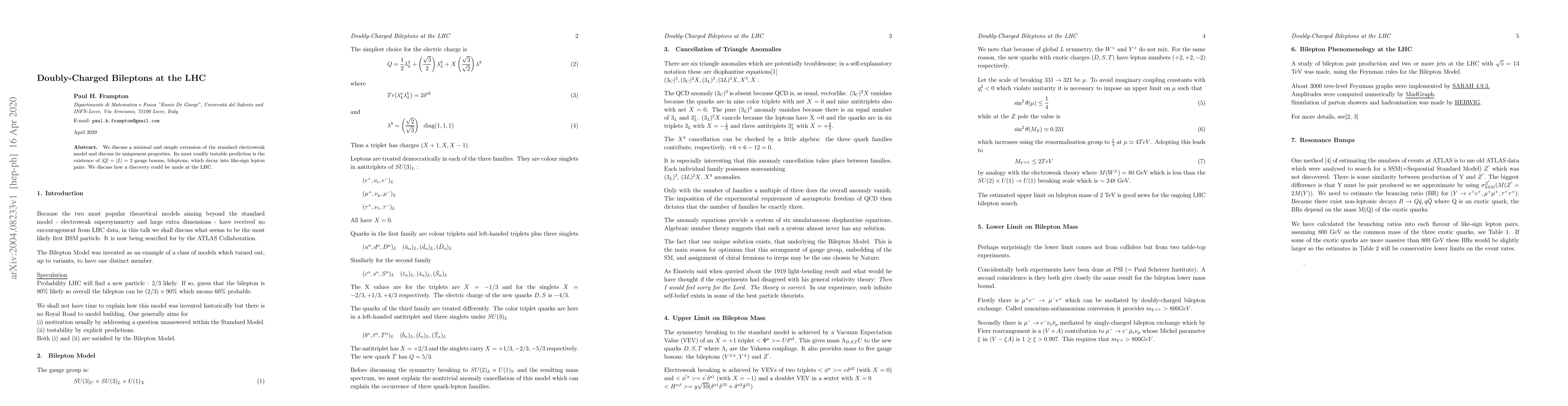 We discuss a minimal and simple extension of the standard electroweak model and discuss its uniqueness properties. Its most readily testable prediction is the existence of $|Q|= |L|= 2$ gauge bosons, bileptons, which decay into like-sign lepton pairs. We discuss how a discovery could be made at the LHC.