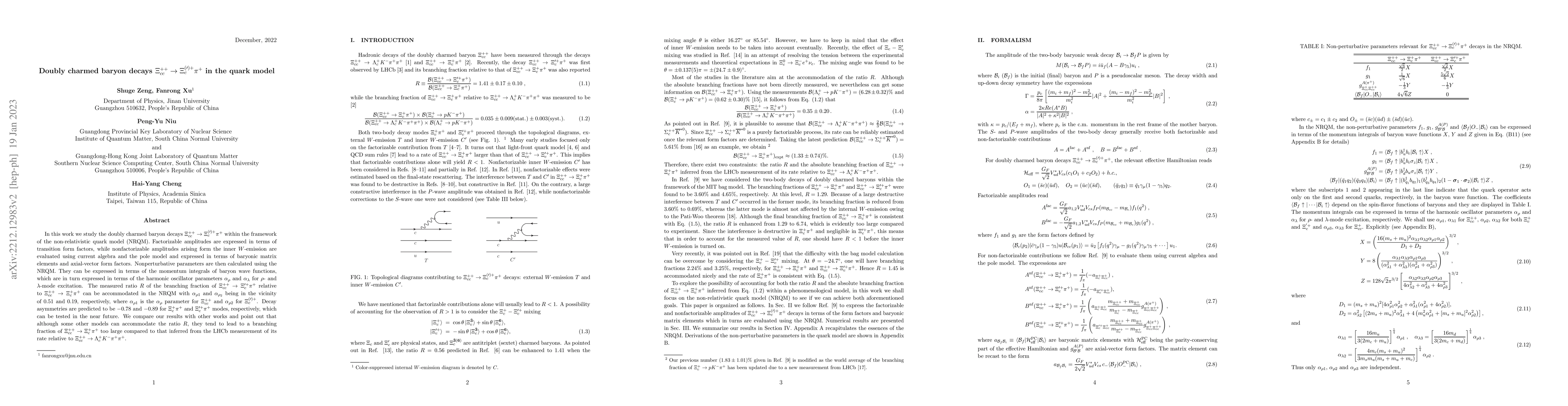 In this work we study the doubly charmed baryon decays $\Xi_{cc}^{++}\to\Xi_c^{(\prime)+}\pi^+$ within the framework of the non-relativistic quark model (NRQM). Factorizable amplitudes are expressed in terms of transition form factors, while nonfactorizable amplitudes arising form the inner $W$-emission are evaluated using current algebra and the pole model and expressed in terms of baryonic matrix elements and axial-vector form factors. Nonperturbative parameters are then calculated using the NRQM. They can be expressed in terms of the momentum integrals of baryon wave functions, which are in turn expressed in terms of the harmonic oscillator parameters $\alpha_\rho$ and $\alpha_\lambda$ for $\rho$- and $\lambda$-mode excitation. The measured ratio $R$ of the branching fraction of $\Xi_{cc}^{++}\to \Xi^{\prime +}_c\pi^+$ relative to $\Xi_{cc}^{++}\to \Xi_c^+\pi^+$ can be accommodated in the NRQM with $\alpha_{\rho 1}$ and $\alpha_{\rho_2}$ being in the vicinity of 0.51 and 0.19, respectively, where $\alpha_{\rho 1}$ is the $\alpha_\rho$ parameter for $\Xi_{cc}^{++}$ and $\alpha_{\rho 2}$ for $\Xi_{c}^{(\prime)+}$. Decay asymmetries are predicted to be $-0.78$ and $-0.89$ for $\Xi_c^+\pi^+$ and $\Xi_c^{\prime +}\pi^+$ modes, respectively, which can be tested in the near future. We compare our results with other works and point out that although some other models can accommodate the ratio $R$, they tend to lead to a branching fraction of $\Xi_{cc}^{++}\to \Xi_c^+\pi^+$ too large compared to that inferred from the LHCb measurement of its rate relative to $\Xi_{cc}^{++}\to\Lambda_c^+ K^- \pi^+\pi^+$.