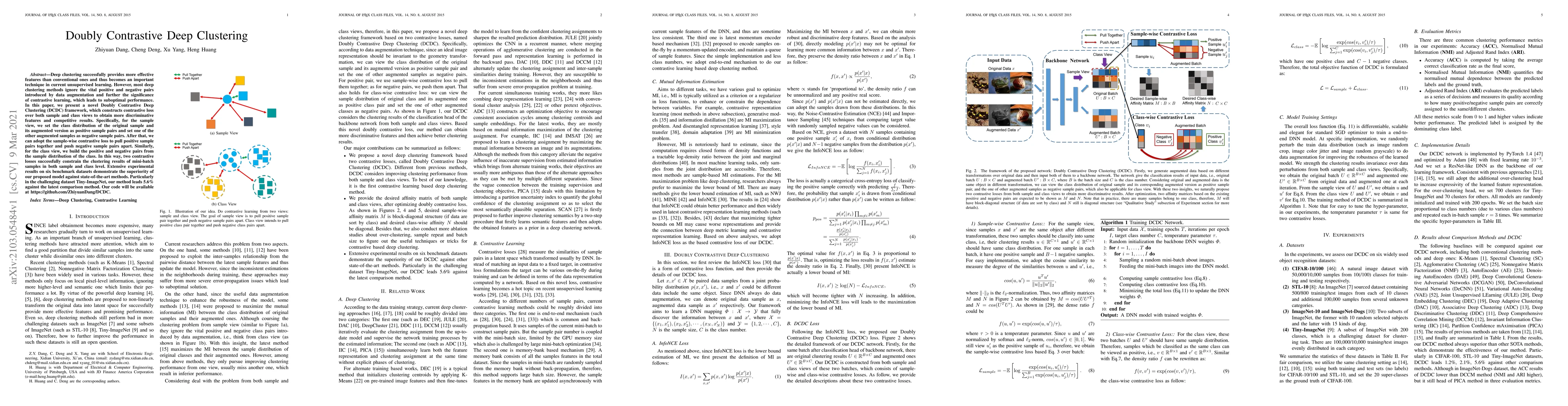 The Doubly Contrastive Deep Clustering (DCDC) framework enhances deep clustering by incorporating contrastive learning over both sample and class views, leading to more discriminative features. Experimental results on six datasets show its superiority, especially achieving a 5.6% improvement over the latest method on Tiny-ImageNet.