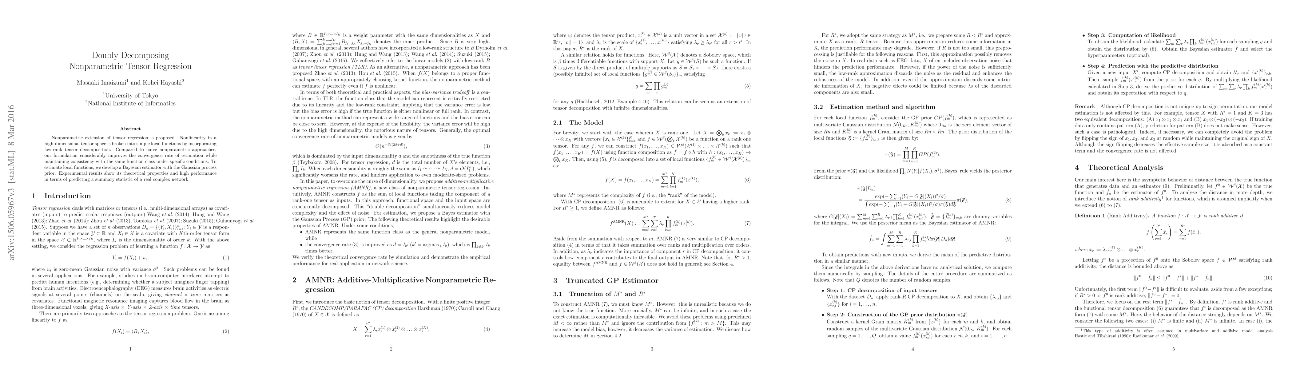 Nonparametric extension of tensor regression is proposed. Nonlinearity in a high-dimensional tensor space is broken into simple local functions by incorporating low-rank tensor decomposition. Compared to naive nonparametric approaches, our formulation considerably improves the convergence rate of estimation while maintaining consistency with the same function class under specific conditions. To estimate local functions, we develop a Bayesian estimator with the Gaussian process prior. Experimental results show its theoretical properties and high performance in terms of predicting a summary statistic of a real complex network.