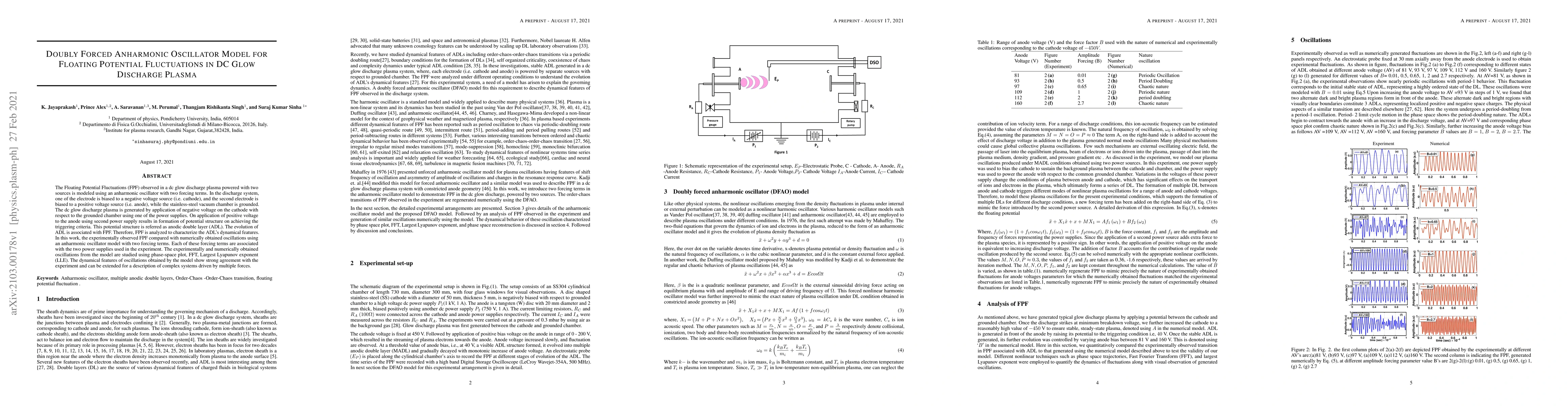 The Floating Potential Fluctuations (FPF) observed in a dc glow discharge plasma powered with two sources is modeled using an anharmonic oscillator with two forcing terms. In the discharge system, one of the electrode is biased to a negative voltage source (i.e. cathode), and the second electrode is biased to a positive voltage source (i.e. anode), while the stainless-steel vacuum chamber is grounded. The dc glow discharge plasma is generated by the application of negative voltage on the cathode with respect to the grounded chamber using one of the power supplies. On the application of positive voltage to the anode using second power supply results in formation of a potential structure on achieving the triggering criteria. This potential structure is referred as anodic double layer (ADL). The evolution of ADL is associated with FPF. Therefore, FPF is analyzed to characterize the ADL's dynamical features. In this work, the experimentally observed FPF compared with numerically obtained oscillations using an anharmonic oscillator model with two forcing terms. Each of these forcing terms are associated with the two power supplies used in the experiment. The experimentally and numerically obtained oscillations from the model are studied using phase-space plot, FFT, Largest Lyapunov exponent (LLE). The dynamical features of oscillations obtained by the model show strong agreement with the experiment and can be extended for a description of complex systems driven by multiple forces.