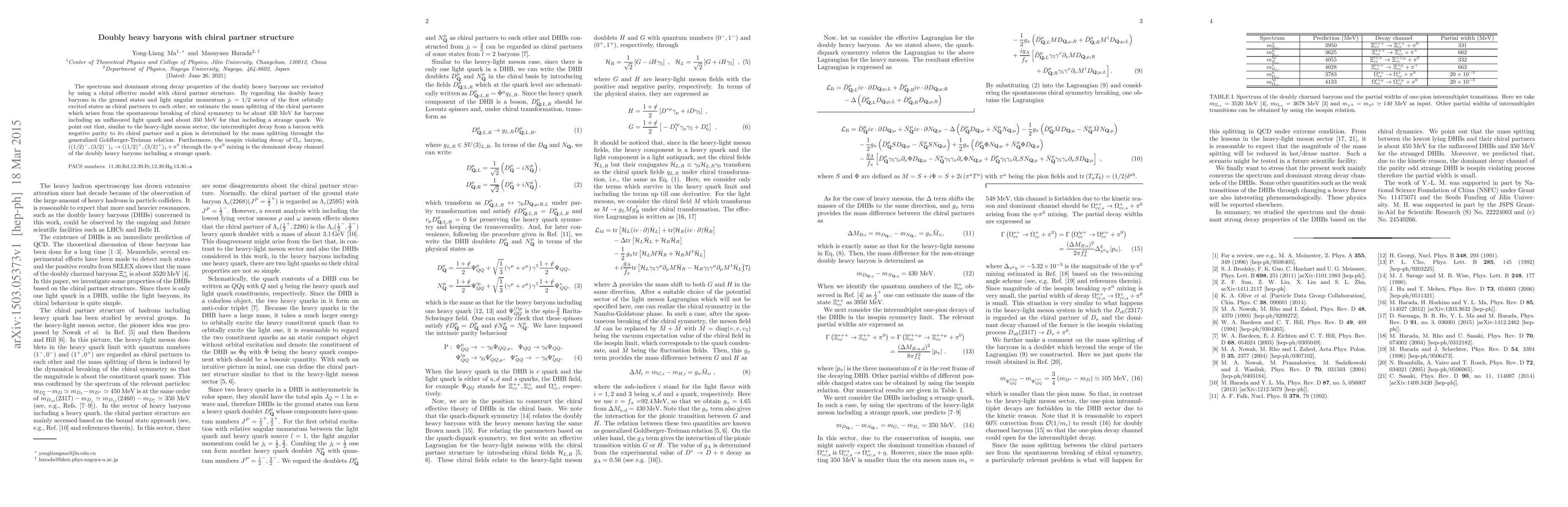 The paper presents a chiral effective model with chiral partner structure for doubly heavy baryons, providing a framework for estimating mass splittings and dominant strong decay properties.