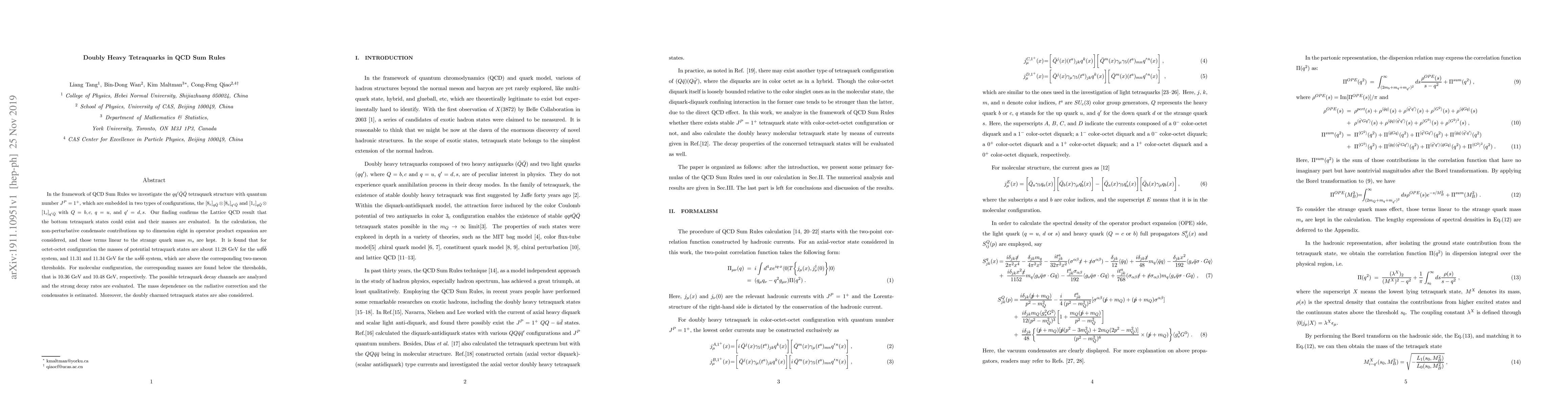 In the framework of QCD Sum Rules we investigate the $q q^\prime \bar{Q} \bar{Q}$ tetraquark structure with quantum number $J^P = 1^+$, which are embedded in two types of configurations, the $[8_c]_{q \bar{Q}} \otimes [8_c]_{q^\prime \bar{Q}}$ and $[1_c]_{q \bar{Q}} \otimes [1_c]_{q^\prime \bar{Q}}$ with $Q = b, c$, $q = u$, and $q^\prime = d, s$. Our finding confirms the Lattice QCD result that the bottom tetraquark states could exist and their masses are evaluated. In the calculation, the non-perturbative condensate contributions up to dimension eight in operator product expansion are considered, and those terms linear to the strange quark mass $m_s$ are kept. It is found that for octet-octet configuration the masses of potential tetraquark states are about $11.28$ GeV for the $ud\bar{b}\bar{b}$ system, and $11.31$ and $11.34$ GeV for the $us\bar{b}\bar{b}$ system, which are above the corresponding two-meson thresholds. For molecular configuration, the corresponding masses are found below the thresholds, that is $10.36$ GeV and $10.48$ GeV, respectively. The possible tetraquark decay channels are analyzed and the strong decay rates are evaluated. The mass dependence on the radiative correction and the condensates is estimated. Moreover, the doubly charmed tetraquark states are also considered.