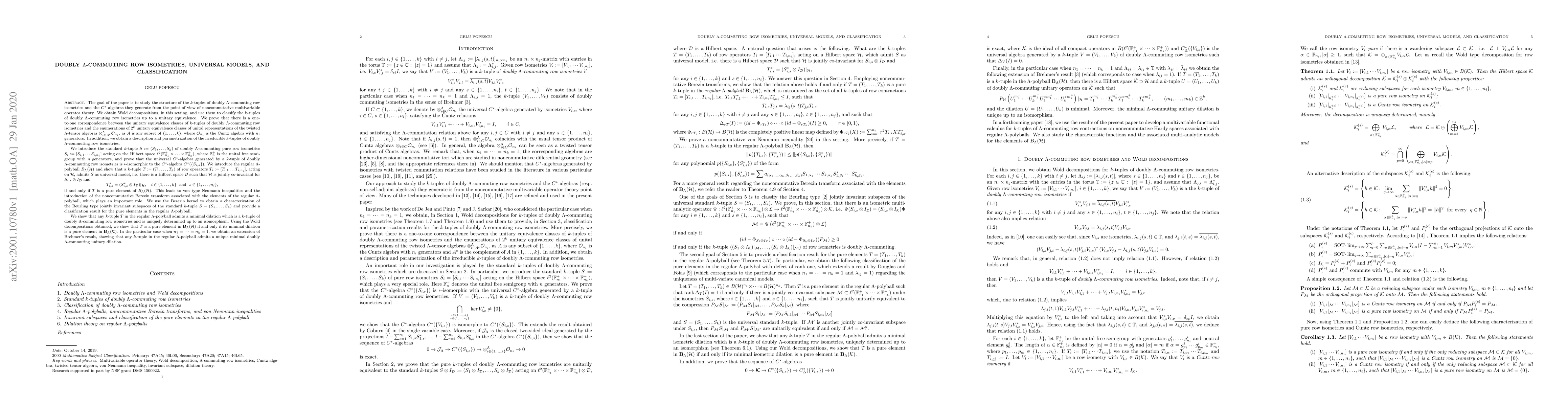 The goal of the paper is to study the structure of the k-tuples of doubly $\Lambda$-commuting row isometries and the $C^*$-algebras they generate from the point of view of noncommutative multivariable operator theory. We obtain Wold decompositions, in this setting, and use them to classify the $k$-tuples of doubly $\Lambda$-commuting row isometries up to a unitary equivalence. We introduce a universal model in this setting, describe its invariant subspaces, and develop a dilation theory on $\Lambda$-polyballs.