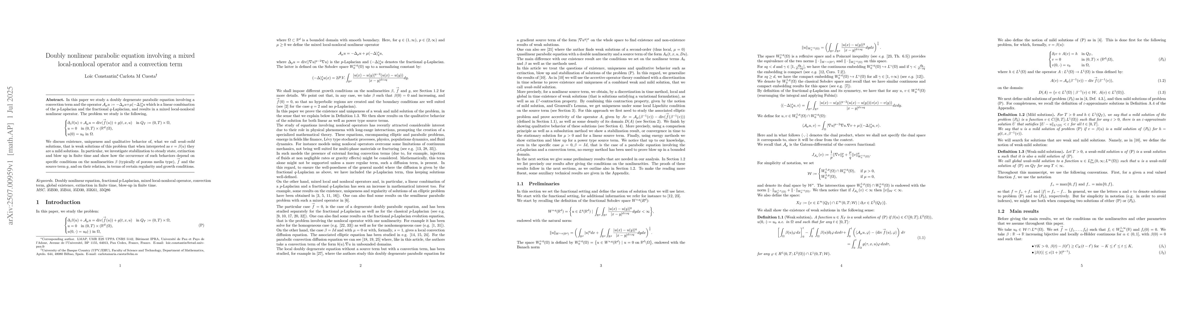 In this paper we study a doubly degenerate parabolic equation involving a convection term and the operator $\mathcal{A}_\mu u:=-\Delta_p u +\mu (-\Delta)^s_q u$ which is a linear combination of the $p$-Laplacian and the fractional $q$-Laplacian, and results in a mixed local-nonlocal nonlinear operator. The problem we study is the following, \begin{equation*} \begin{cases} \partial_t \beta(u)+ \mathcal{A}_\mu u= div (\overset{\to}{f}(u))+g(t,x,u) \quad \text{in} \;Q_T:=(0,T)\times \Omega, u=0 \quad \text{in} \; (0,T)\times (\mathbb{R}^d \backslash \Omega), u(0)=u_0 \text{ in } \Omega. \end{cases}\ \end{equation*} We discuss existence, uniqueness and qualitative behavior of, what we call {\it weak-mild} solutions, that is weak solutions of this problem that when interpreted as $v=\beta(u)$ they are a mild solutions. In particular, we investigate stabilization to steady state, extinction and blow up in finite time and show how the occurrence of such behaviors depend on specific conditions on the nonlinearities $\beta$ (typically of porous media type), $\overset{\to}{f}$ and the source term $g$, and on their relation, in terms of certain regularity and growth conditions.