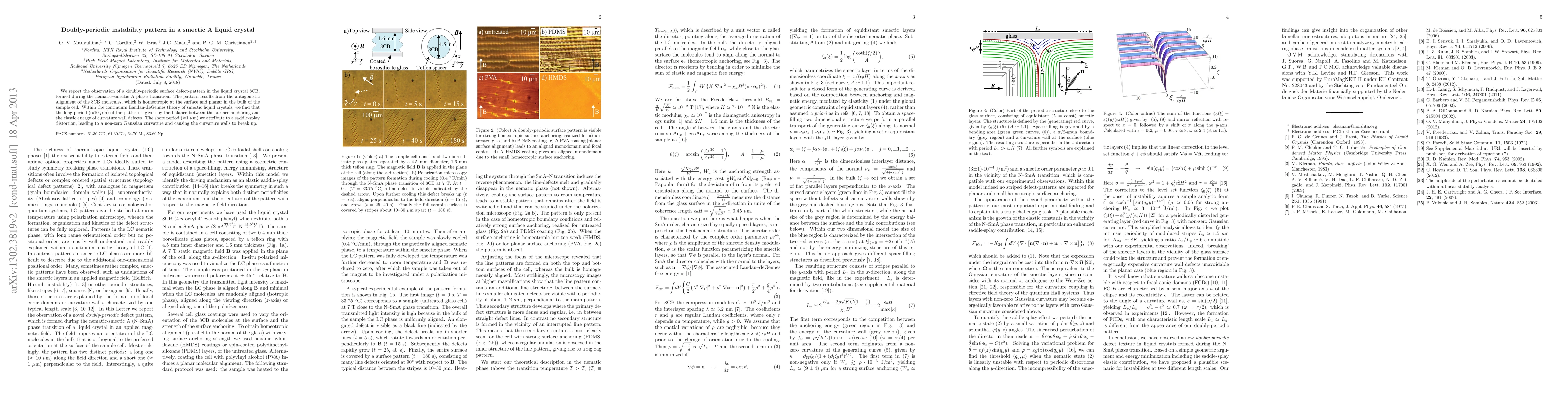 This paper observes a doubly-periodic defect pattern in 8CB liquid crystals during the nematic-to-smectic A phase transition, driven by conflicting molecular alignments. The pattern's long period (~10 μm) is explained by the balance of surface anchoring and elastic energy, while the short period (~1 μm) arises from saddle-splay distortion and Gaussian curvature effects.