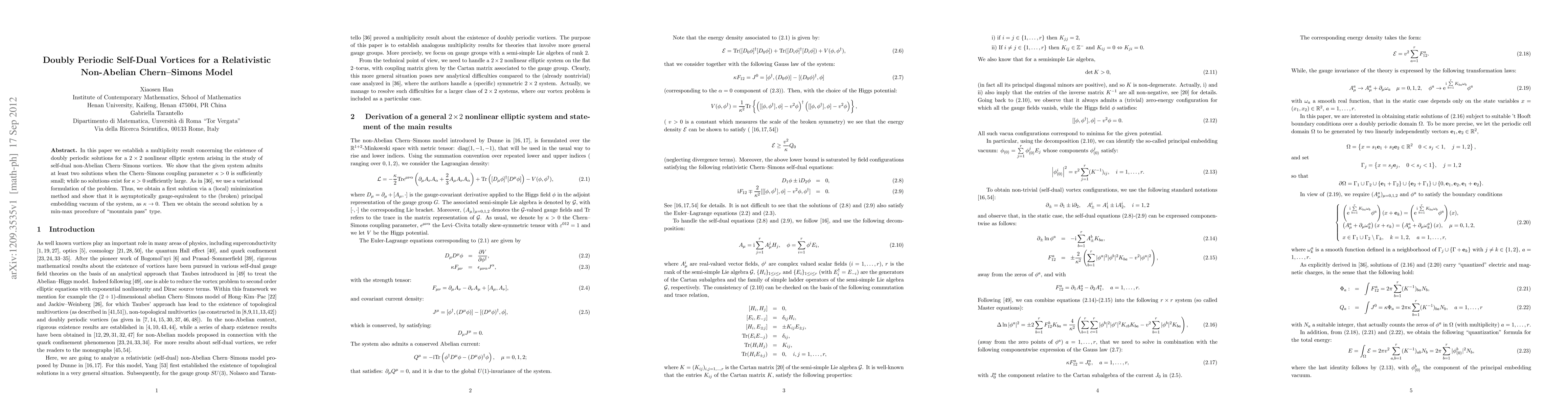 The paper presents a detailed variational approach to prove the existence of at least two doubly periodic self-dual vortex solutions for a nonlinear elliptic system in a relativistic non-Abelian Chern-Simons model.
