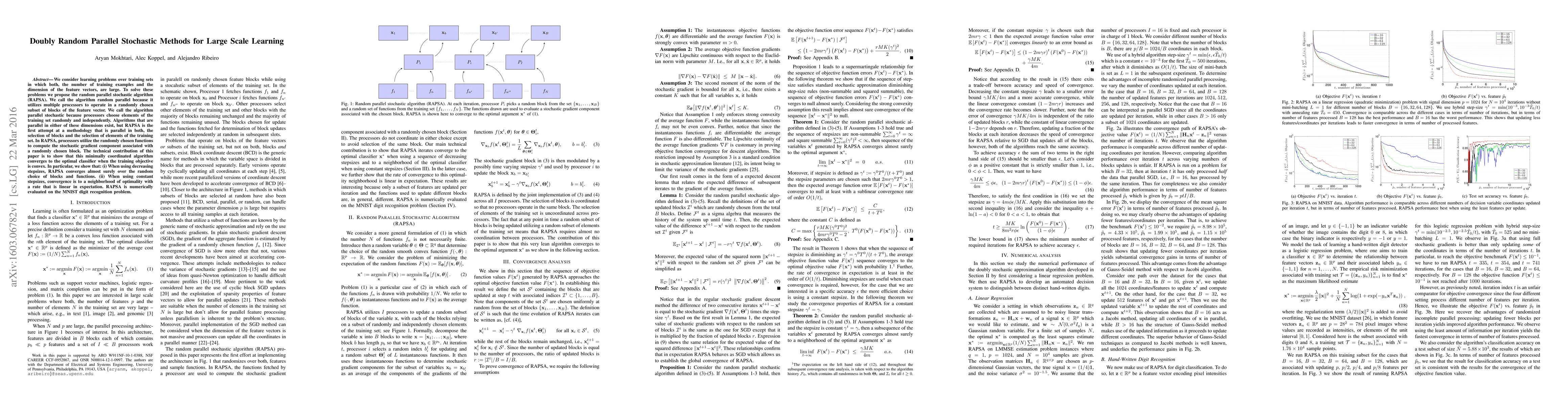We consider learning problems over training sets in which both, the number of training examples and the dimension of the feature vectors, are large. To solve these problems we propose the random parallel stochastic algorithm (RAPSA). We call the algorithm random parallel because it utilizes multiple processors to operate in a randomly chosen subset of blocks of the feature vector. We call the algorithm parallel stochastic because processors choose elements of the training set randomly and independently. Algorithms that are parallel in either of these dimensions exist, but RAPSA is the first attempt at a methodology that is parallel in both, the selection of blocks and the selection of elements of the training set. In RAPSA, processors utilize the randomly chosen functions to compute the stochastic gradient component associated with a randomly chosen block. The technical contribution of this paper is to show that this minimally coordinated algorithm converges to the optimal classifier when the training objective is convex. In particular, we show that: (i) When using decreasing stepsizes, RAPSA converges almost surely over the random choice of blocks and functions. (ii) When using constant stepsizes, convergence is to a neighborhood of optimality with a rate that is linear in expectation. RAPSA is numerically evaluated on the MNIST digit recognition problem.