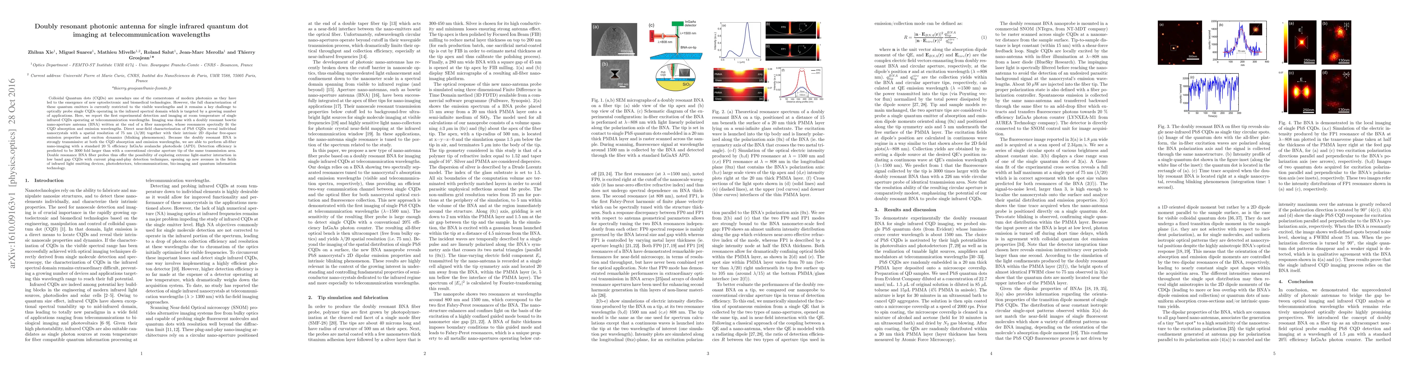 This paper reports the first room-temperature imaging of single infrared quantum dots at telecommunication wavelengths using a doubly resonant bowtie nano-aperture antenna. The technique achieves 75 nm spatial resolution and reveals intrinsic emission properties, with predicted detection efficiency 3000 times greater than conventional methods.