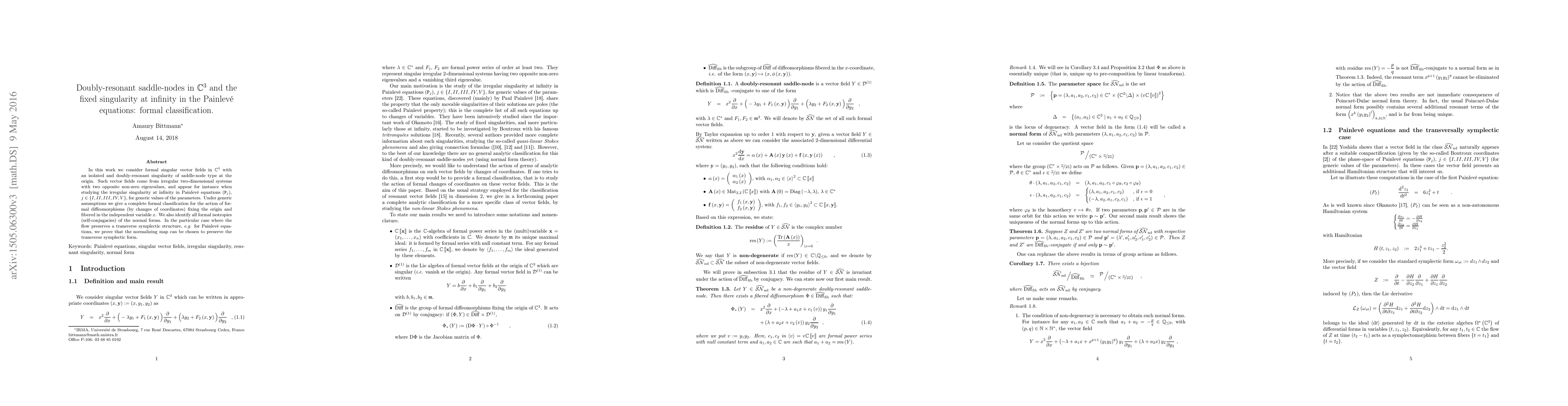 In this work we consider formal singular vector fields in $ C^{3}$with an isolated and doubly-resonant singularity of saddle-node typeat the origin. Such vector fields come from irregular two-dimensionalsystems with two opposite non-zero eigenvalues, and appear for instancewhen studying the irregular singularity at infinity in Painlev{\'e} equations$(P\_{j})\_{j\in(I,II,III,IV,V)}$, for generic values of the parameters.Under generic assumptions we give a complete formal classificationfor the action of formal diffeomorphisms (by changes of coordinates)fixing the origin and fibered in the independent variable. Wealso identify all formal isotropies (self-conjugacies) of the normalforms. In the particular case where the flow preserves a transversesymplectic structure, e.g. for Painlev{\'e} equations, we provethat the normalizing map can be chosen to preserve the transversesymplectic form.