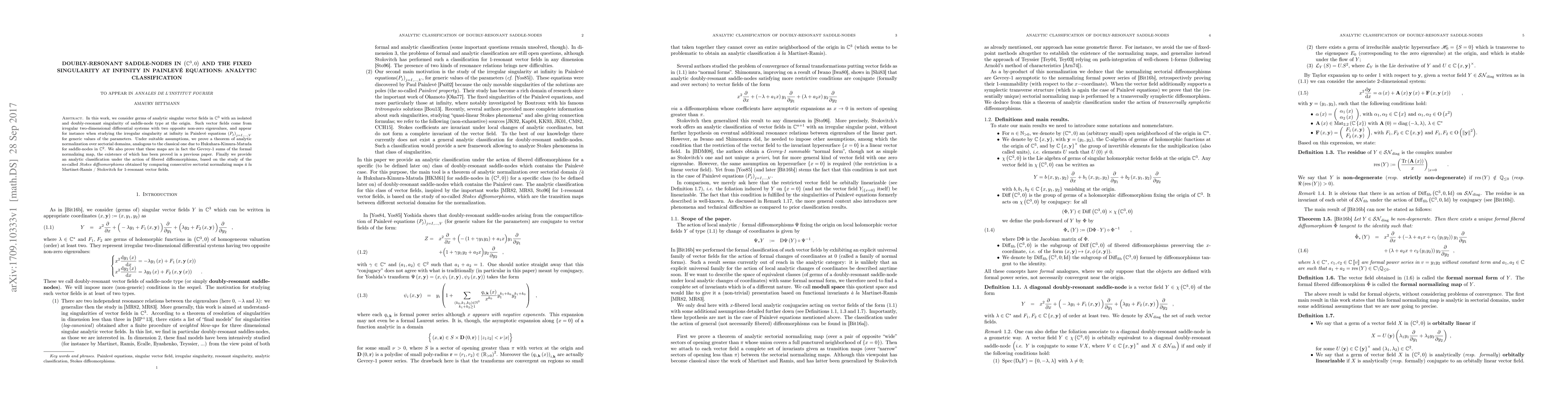 In this work, we consider germs of analytic singular vector elds in (C^3,0) with an isolated and doubly-resonant singularity of saddle-node type at the origin. Such vector elds come from irregular two-dimensional dierential systems with two opposite non-zero eigenvalues, and appear for instance when studying the irregular singularity at innity in Painlev{\'e} equations (P j) j=I,...,V for generic values of the parameters. Under suitable assumptions, we prove a theorem of analytic normalization over sectorial domains, analogous to the classical one due to Hukuhara-Kimura-Matuda for saddle-nodes in (C^2,0). We also prove that these maps are in fact the Gevrey-1 sums of the formal normalizing map, the existence of which has been proved in a previous paper. Finally we provide an analytic classication under the action of bered dieomorphisms, based on the study of the so-called Stokes dieomorphisms obtained by comparing consecutive sectorial normalizing maps {\`a} la Martinet-Ramis / Stolovitch for 1-resonant vector fields.