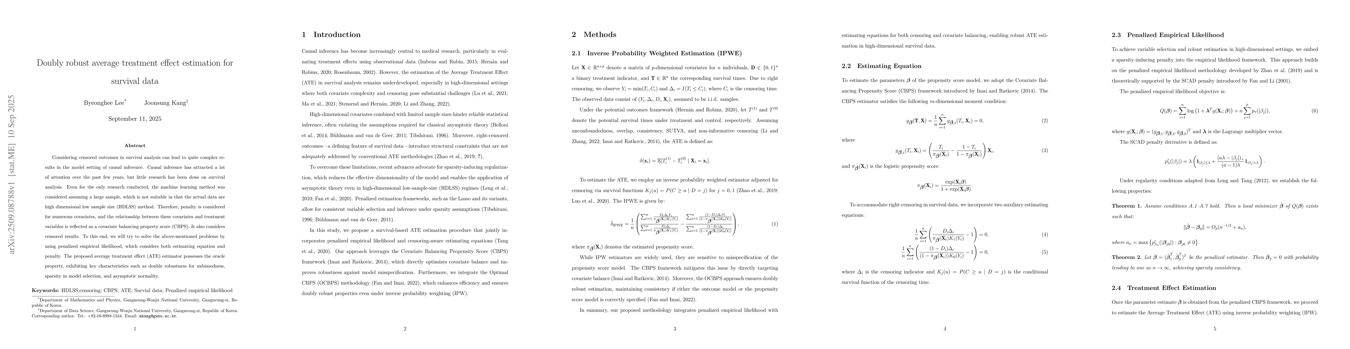 Considering censored outcomes in survival analysis can lead to quite complex results in the model setting of causal inference. Causal inference has attracted a lot of attention over the past few years, but little research has been done on survival analysis. Even for the only research conducted, the machine learning method was considered assuming a large sample, which is not suitable in that the actual data are high dimensional low sample size (HDLSS) method. Therefore, penalty is considered for numerous covariates, and the relationship between these covariates and treatment variables is reflected as a covariate balancing property score (CBPS). It also considers censored results. To this end, we will try to solve the above-mentioned problems by using penalized empirical likelihood, which considers both estimating equation and penalty. The proposed average treatment effect (ATE) estimator possesses the oracle property, exhibiting key characteristics such as double robustness for unbiasedness, sparsity in model selection, and asymptotic normality.
