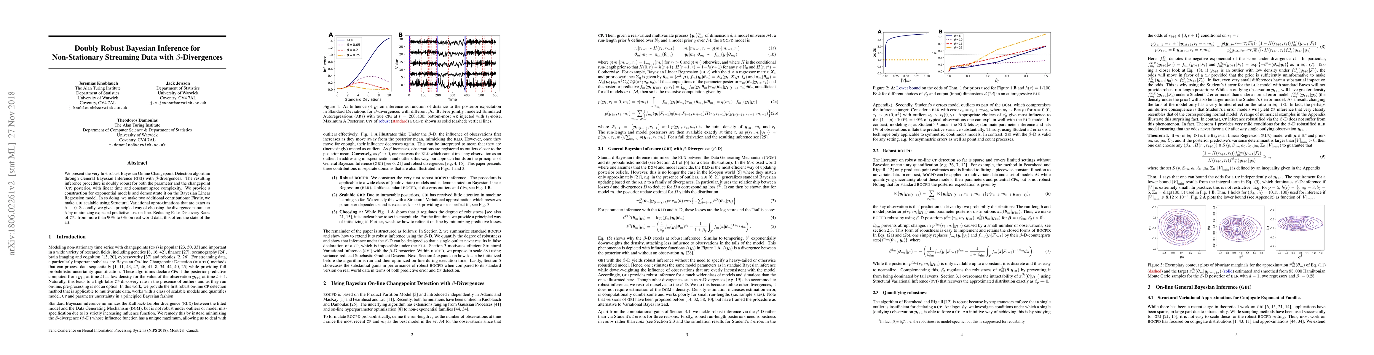 This paper introduces a novel robust Bayesian Online Changepoint Detection algorithm using General Bayesian Inference with $\beta$-divergences, offering doubly robust inference with linear time and constant space complexity. It also scales GBI via Structural Variational approximations and provides a method for choosing $\beta$ to minimize predictive loss, achieving state-of-the-art results in reducing false discovery rates.