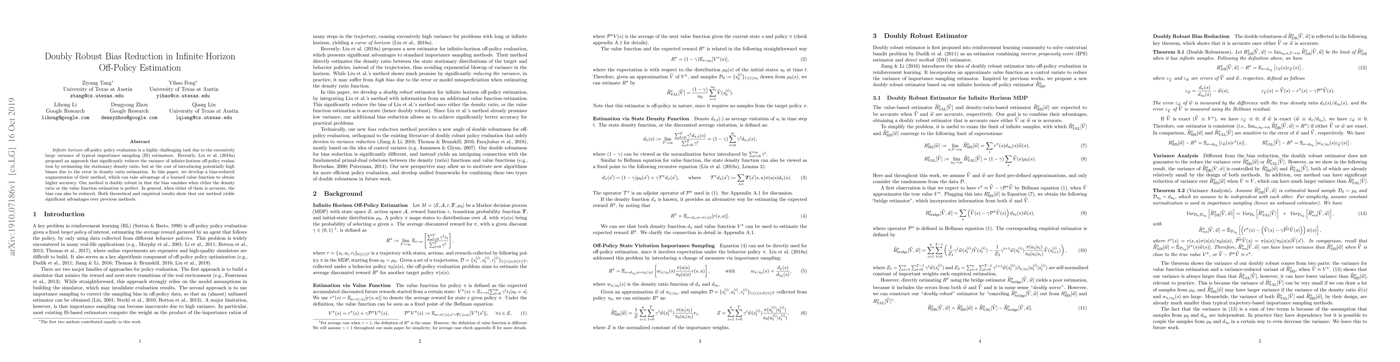 This paper presents a doubly robust method for reducing bias in infinite horizon off-policy evaluation, combining importance sampling with a learned value function. The approach ensures bias reduction under perfect estimation of either component and shows significant improvements over previous variance-reduction techniques.
