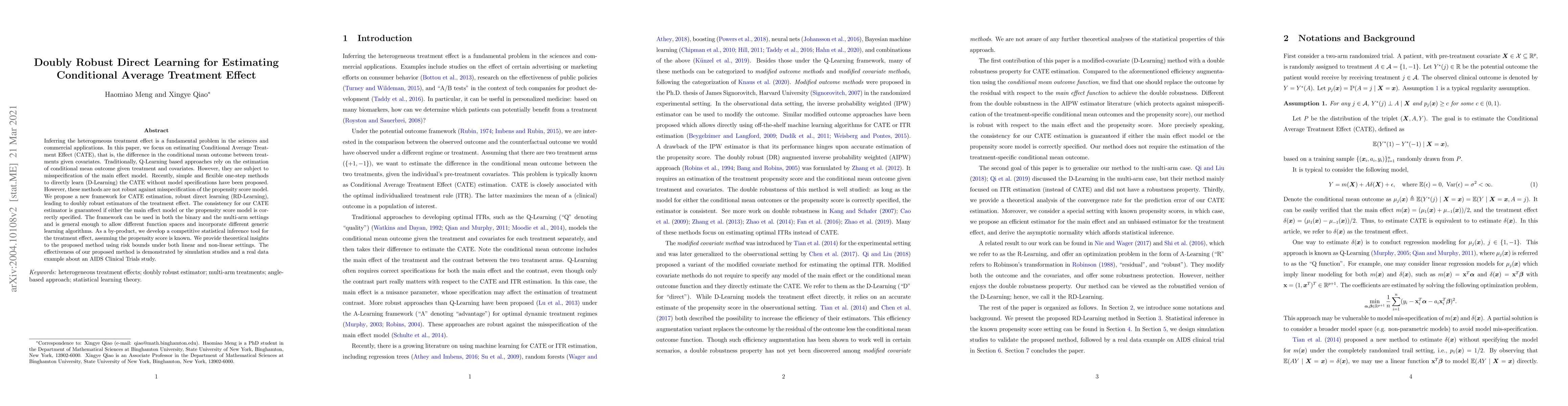 This paper proposes a doubly robust direct learning framework for estimating Conditional Average Treatment Effect (CATE), ensuring consistency if either the main effect or propensity score model is correctly specified. The method is shown to be effective through simulations and a real-world AIDS Clinical Trials study.