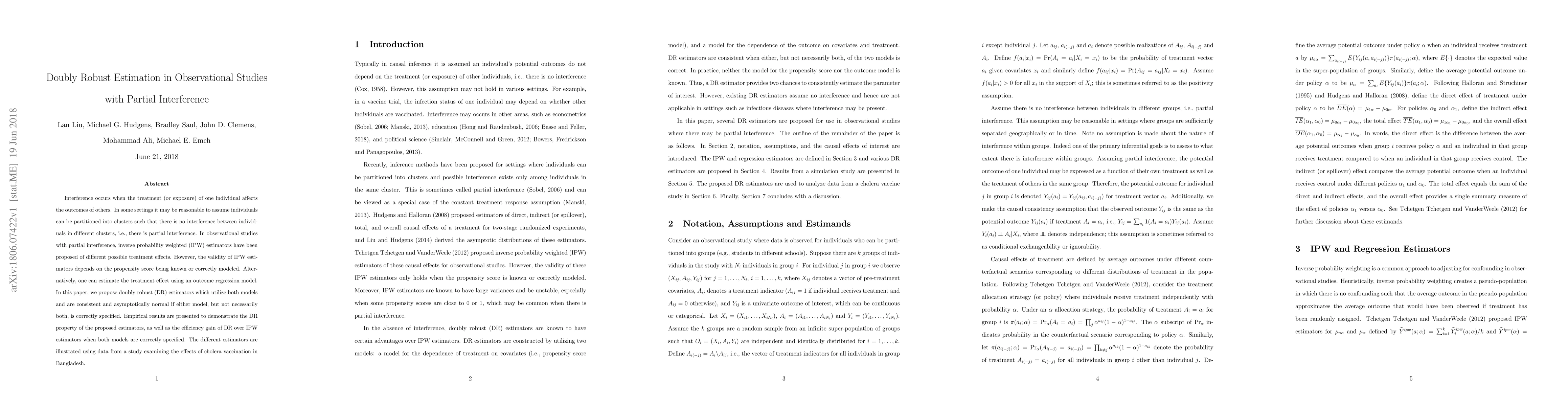 This paper proposes doubly robust (DR) estimators for observational studies with partial interference, combining inverse probability weighting and outcome regression models to ensure consistency and efficiency even if only one model is correctly specified. Empirical results show DR estimators outperform IPW estimators, illustrated using cholera vaccination data in Bangladesh.