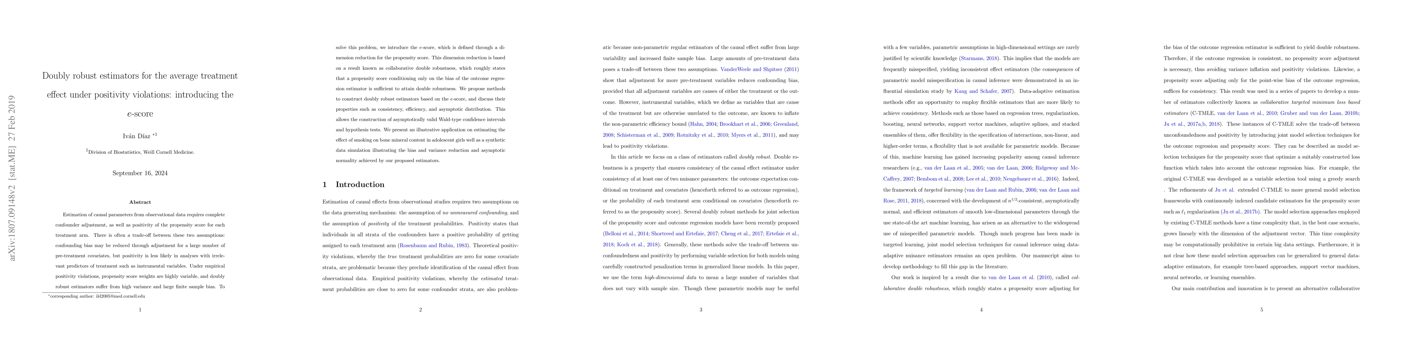 Estimation of causal parameters from observational data requires complete confounder adjustment, as well as positivity of the propensity score for each treatment arm. There is often a trade-off between these two assumptions: confounding bias may be reduced through adjustment for a large number of pre-treatment covariates, but positivity is less likely in analyses with irrelevant predictors of treatment such as instrumental variables. Under empirical positivity violations, propensity score weights are highly variable, and doubly robust estimators suffer from high variance and large finite sample bias. To solve this problem, we introduce the $e$-score, which is defined through a dimension reduction for the propensity score. This dimension reduction is based on a result known as collaborative double robustness, which roughly states that a propensity score conditioning only on the bias of the outcome regression estimator is sufficient to attain double robustness. We propose methods to construct doubly robust estimators based on the $e$-score, and discuss their properties such as consistency, efficiency, and asymptotic distribution. This allows the construction of asymptotically valid Wald-type confidence intervals and hypothesis tests. We present an illustrative application on estimating the effect of smoking on bone mineral content in adolescent girls well as a synthetic data simulation illustrating the bias and variance reduction and asymptotic normality achieved by our proposed estimators.