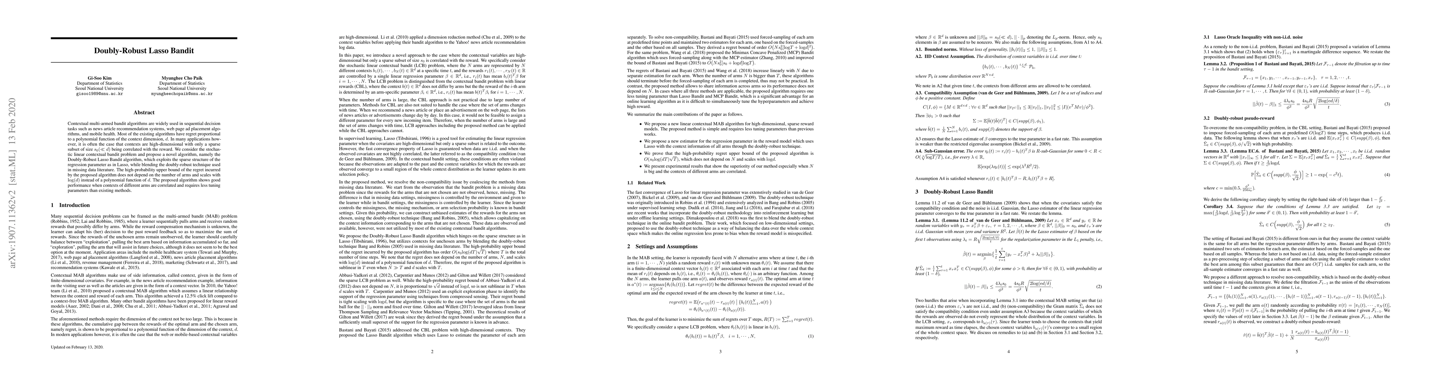 The Doubly-Robust Lasso Bandit algorithm addresses high-dimensional contextual bandit problems by leveraging sparse structure and doubly-robust techniques, achieving regret scaling with log(d) instead of a polynomial function of d, and requiring fewer tuning parameters.