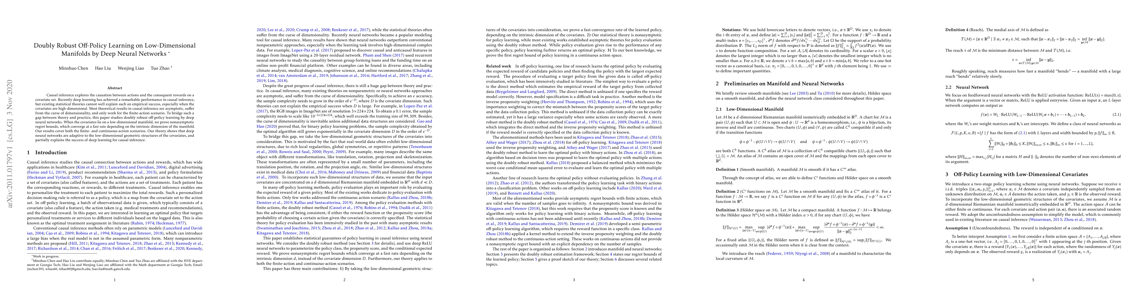 Causal inference explores the causation between actions and the consequent rewards on a covariate set. Recently deep learning has achieved a remarkable performance in causal inference, but existing statistical theories cannot well explain such an empirical success, especially when the covariates are high-dimensional. Most theoretical results in causal inference are asymptotic, suffer from the curse of dimensionality, and only work for the finite-action scenario. To bridge such a gap between theory and practice, this paper studies doubly robust off-policy learning by deep neural networks. When the covariates lie on a low-dimensional manifold, we prove nonasymptotic regret bounds, which converge at a fast rate depending on the intrinsic dimension of the manifold. Our results cover both the finite- and continuous-action scenarios. Our theory shows that deep neural networks are adaptive to the low-dimensional geometric structures of the covariates, and partially explains the success of deep learning for causal inference.