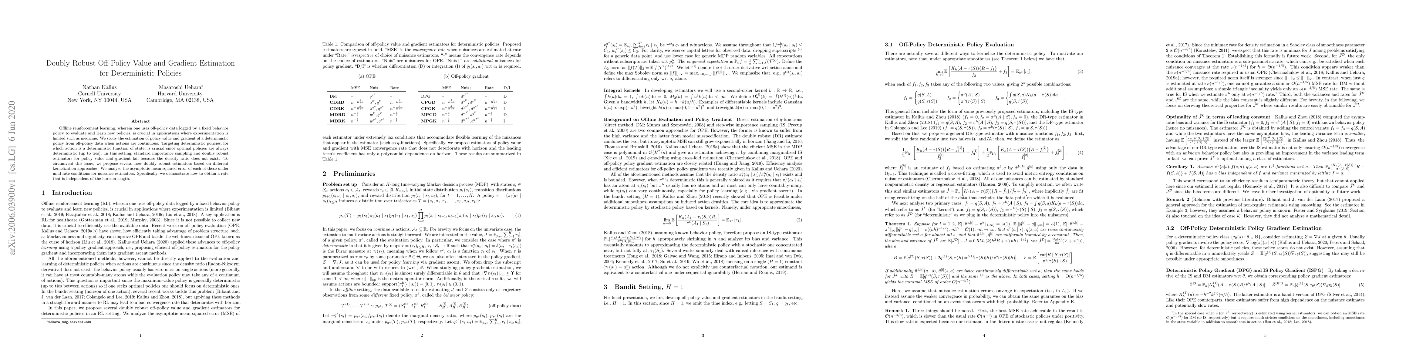 This paper proposes new doubly robust estimators for evaluating and learning deterministic policies in offline reinforcement learning using off-policy data. The authors address the challenge of continuous actions and the absence of density ratios by introducing kernelization techniques, and analyze their asymptotic mean-squared error under mild conditions.