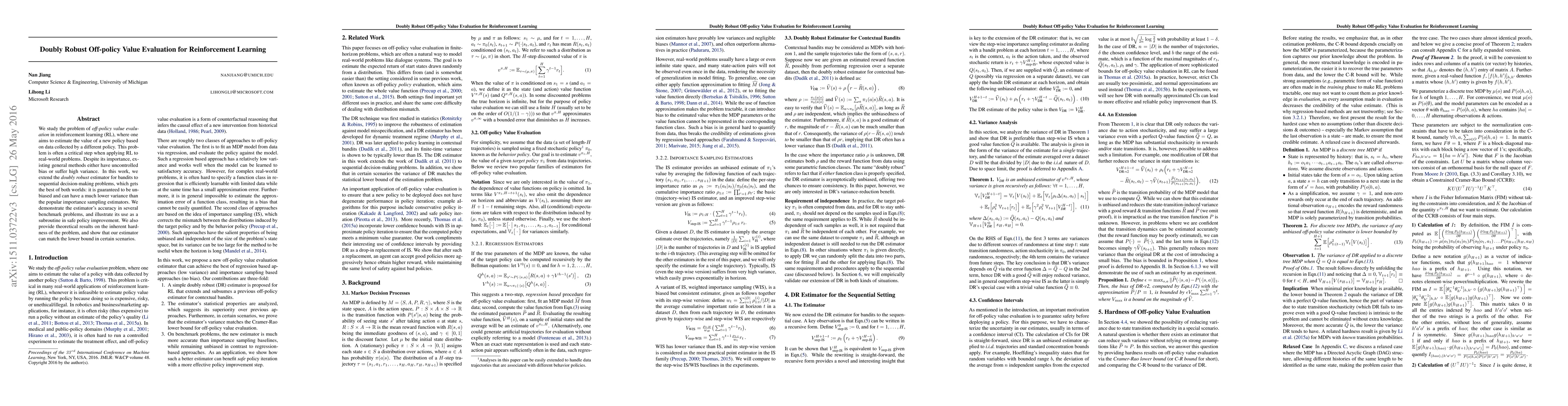 This paper proposes a doubly robust estimator for off-policy value evaluation in reinforcement learning, achieving both low bias and variance. The method extends the doubly robust estimator from bandit problems to sequential decision-making, demonstrating improved accuracy in benchmarks and theoretical guarantees on its performance.