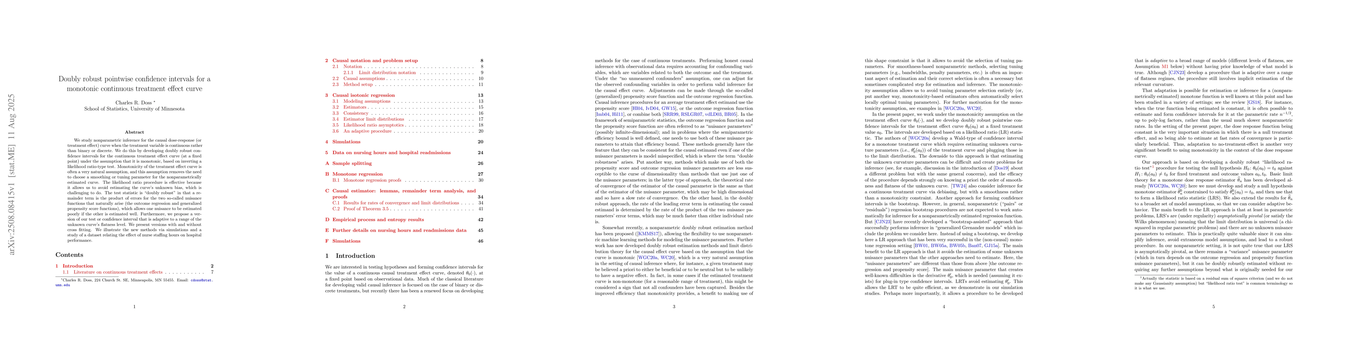 We study nonparametric inference for the causal dose-response (or treatment effect) curve when the treatment variable is continuous rather than binary or discrete. We do this by developing doubly robust confidence intervals for the continuous treatment effect curve (at a fixed point) under the assumption that it is monotonic, based on inverting a likelihood ratio-type test. Monotonicity of the treatment effect curve is often a very natural assumption, and this assumption removes the need to choose a smoothing or tuning parameter for the nonparametrically estimated curve. The likelihood ratio procedure is effective because it allows us to avoid estimating the curve's unknown bias, which is challenging to do. The test statistic is ``doubly robust'' in that a remainder term is the product of errors for the two so-called nuisance functions that naturally arise (the outcome regression and generalized propensity score functions), which allows one nuisance to be estimated poorly if the other is estimated well. Furthermore, we propose a version of our test or confidence interval that is adaptive to a range of the unknown curve's flatness level. We present versions with and without cross fitting. We illustrate the new methods via simulations and a study of a dataset relating the effect of nurse staffing hours on hospital performance.