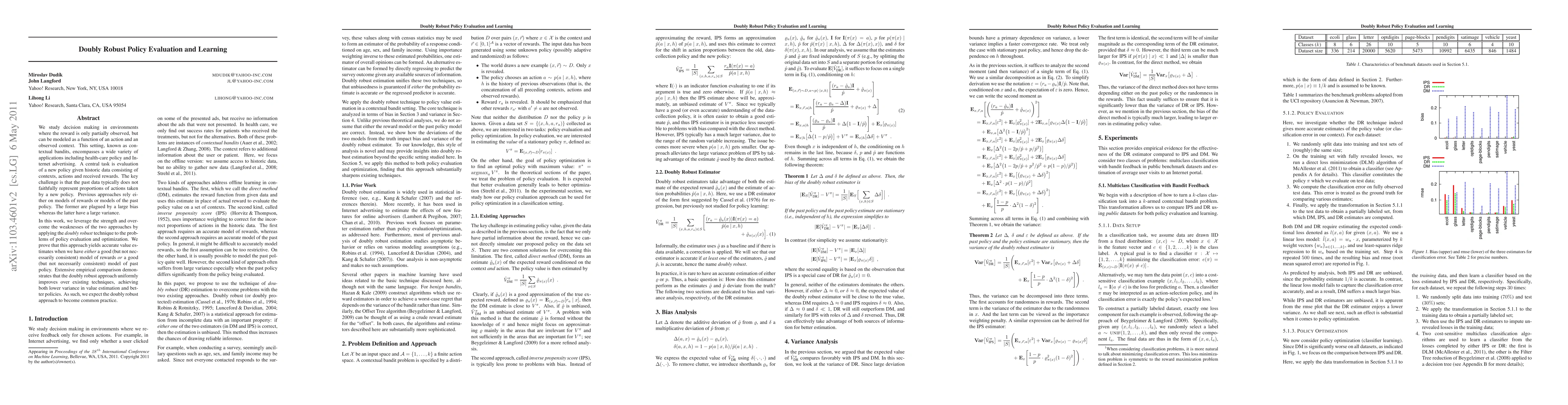 This paper proposes a doubly robust technique for policy evaluation in contextual bandits, where rewards are partially observed. It combines the strengths of both reward and policy models to achieve accurate value estimates, demonstrating lower variance and better policy optimization compared to existing methods.