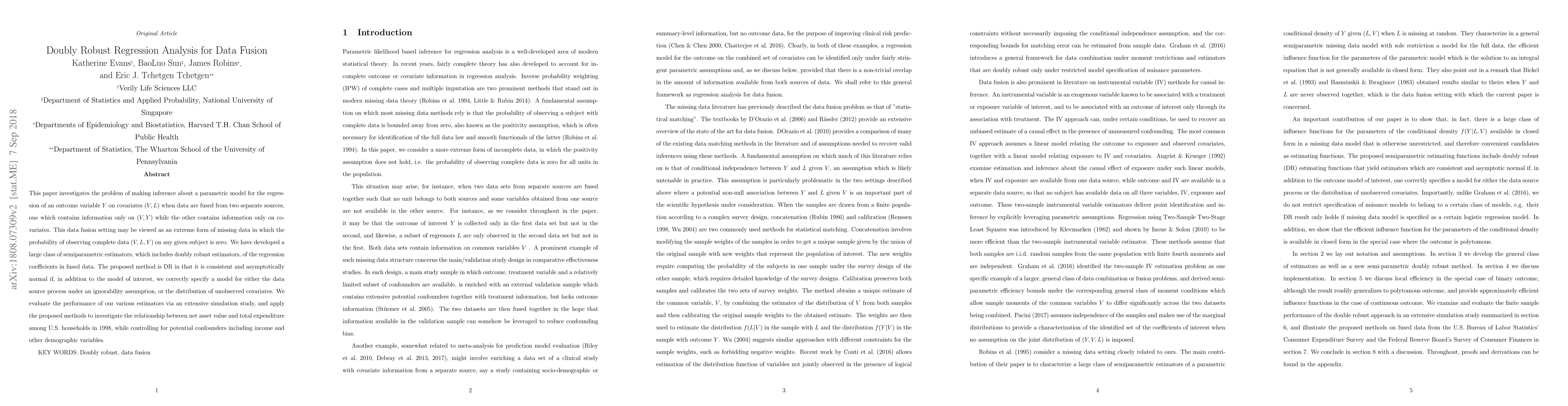 This paper investigates the problem of making inference about a parametric model for the regression of an outcome variable $Y$ on covariates $(V,L)$ when data are fused from two separate sources, one which contains information only on $(V, Y)$ while the other contains information only on covariates. This data fusion setting may be viewed as an extreme form of missing data in which the probability of observing complete data $(V,L,Y)$ on any given subject is zero. We have developed a large class of semiparametric estimators, which includes doubly robust estimators, of the regression coefficients in fused data. The proposed method is DR in that it is consistent and asymptotically normal if, in addition to the model of interest, we correctly specify a model for either the data source process under an ignorability assumption, or the distribution of unobserved covariates. We evaluate the performance of our various estimators via an extensive simulation study, and apply the proposed methods to investigate the relationship between net asset value and total expenditure among U.S. households in 1998, while controlling for potential confounders including income and other demographic variables.