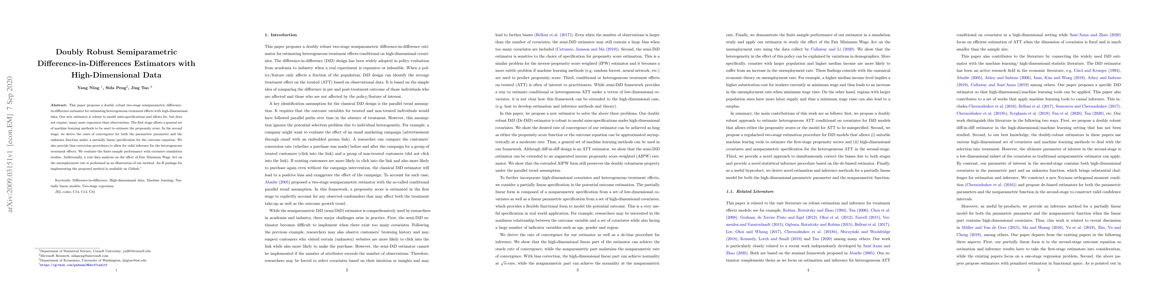 This paper introduces a doubly robust semiparametric difference-in-difference estimator for high-dimensional data, robust to model misspecifications and capable of handling more predictors than observations. The method employs machine learning for propensity score estimation and provides bias correction for valid inference.