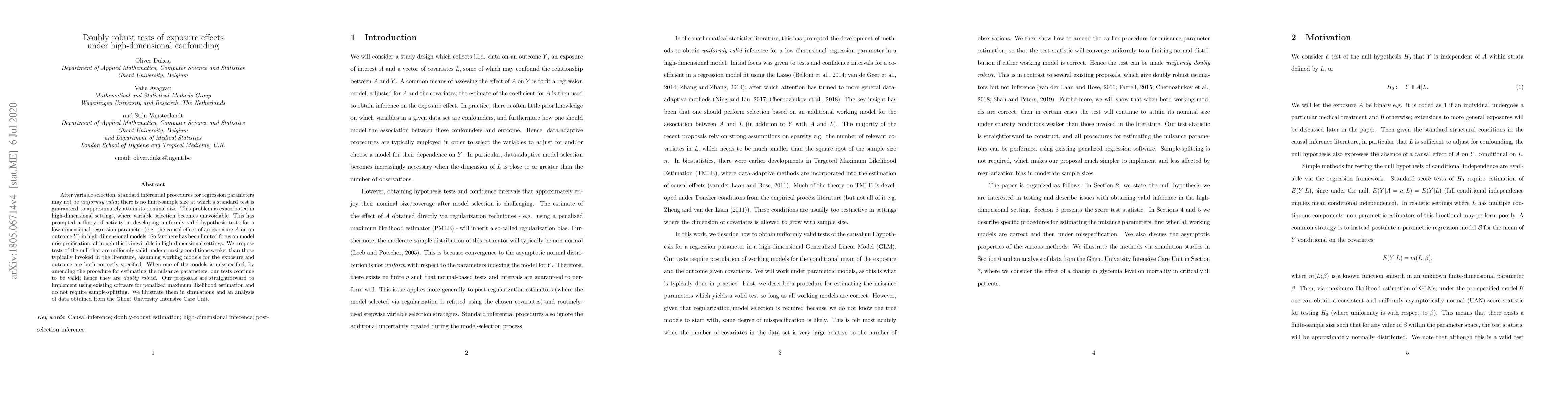 Researchers propose doubly robust tests for causal effects in high-dimensional models with weak sparsity conditions, ensuring validity under model misspecification without requiring sample-splitting or specialized software.
