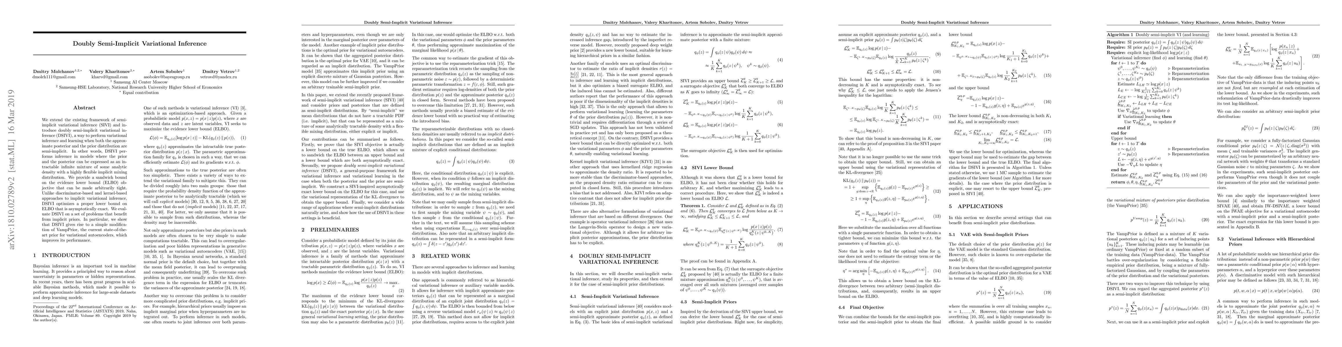 This paper introduces doubly semi-implicit variational inference (DSIVI), an advanced method for variational inference where both the approximate posterior and prior distributions are semi-implicit. It optimizes an asymptotically exact lower bound on the evidence lower bound (ELBO) and improves upon VampPrior for variational autoencoders.