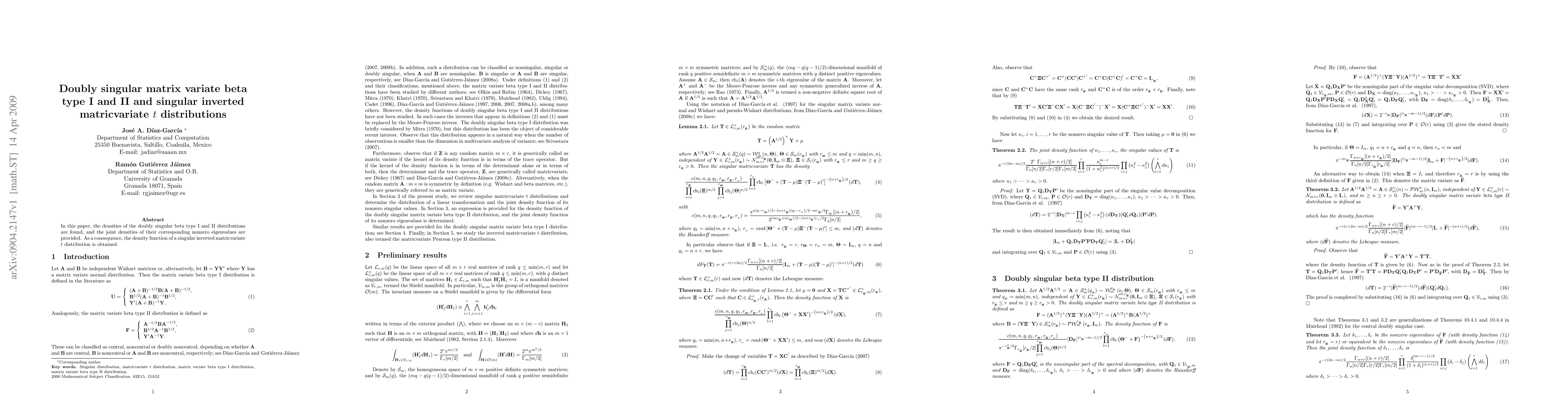 In this paper, the densities of the doubly singular beta type I and II distributions are found, and the joint densities of their corresponding nonzero eigenvalues are provided. As a consequence, the density function of a singular inverted matricvariate t distribution is obtained.