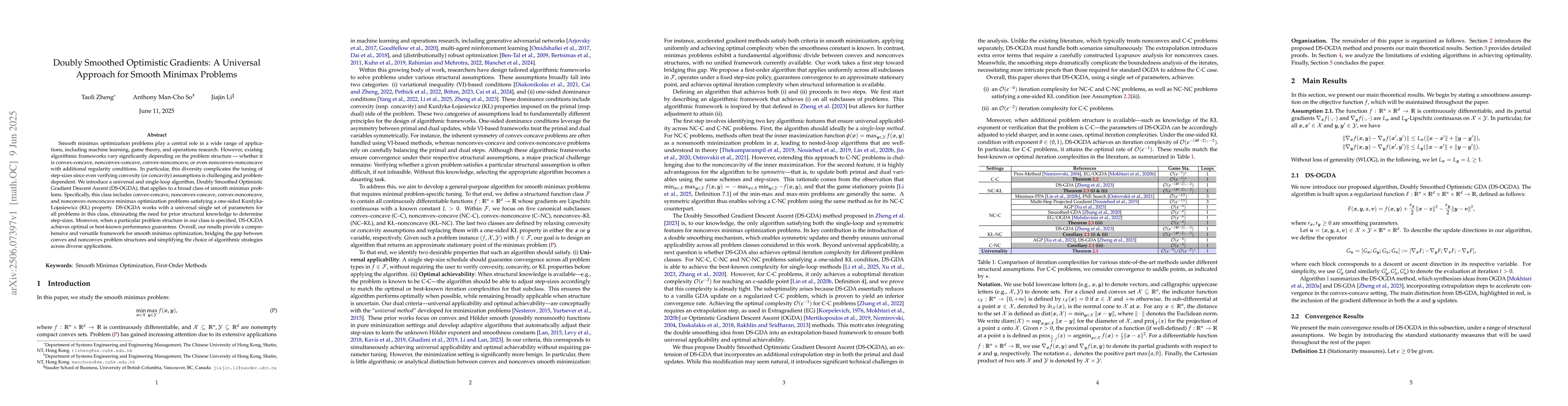 Smooth minimax optimization problems play a central role in a wide range of applications, including machine learning, game theory, and operations research. However, existing algorithmic frameworks vary significantly depending on the problem structure -- whether it is convex-concave, nonconvex-concave, convex-nonconcave, or even nonconvex-nonconcave with additional regularity conditions. In particular, this diversity complicates the tuning of step-sizes since even verifying convexity (or concavity) assumptions is challenging and problem-dependent. We introduce a universal and single-loop algorithm, Doubly Smoothed Optimistic Gradient Descent Ascent (DS-OGDA), that applies to a broad class of smooth minimax problems. Specifically, this class includes convex-concave, nonconvex-concave, convex-nonconcave, and nonconvex-nonconcave minimax optimization problems satisfying a one-sided Kurdyka-Lojasiewicz (KL) property. DS-OGDA works with a universal single set of parameters for all problems in this class, eliminating the need for prior structural knowledge to determine step-sizes. Moreover, when a particular problem structure in our class is specified, DS-OGDA achieves optimal or best-known performance guarantees. Overall, our results provide a comprehensive and versatile framework for smooth minimax optimization, bridging the gap between convex and nonconvex problem structures and simplifying the choice of algorithmic strategies across diverse applications.