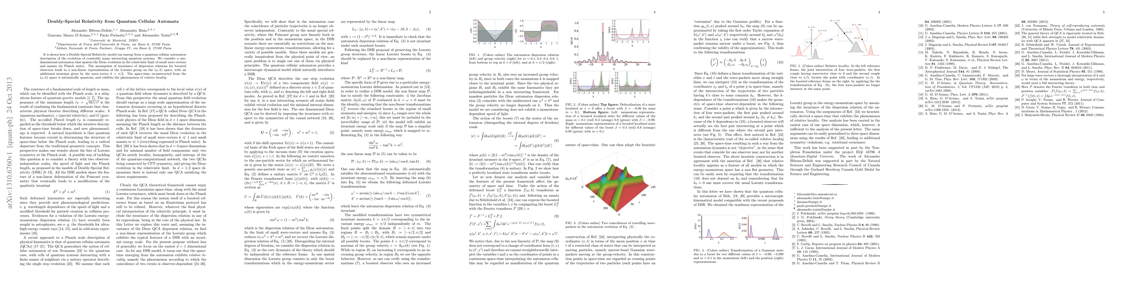 It is shown how a Doubly-Special Relativity model can emerge from a quantum cellular automaton description of the evolution of countably many interacting quantum systems. We consider a one-dimensional automaton that spawns the Dirac evolution in the relativistic limit of small wave-vectors and masses (in Planck units). The assumption of invariance of dispersion relations for boosted observers leads to a non-linear representation of the Lorentz group on the $(\omega,k)$ space, with an additional invariant given by the wave-vector $k=\pi /2$. The space-time reconstructed from the $(\omega,k)$ space is intrinsically quantum, and exhibits the phenomenon of relative locality.