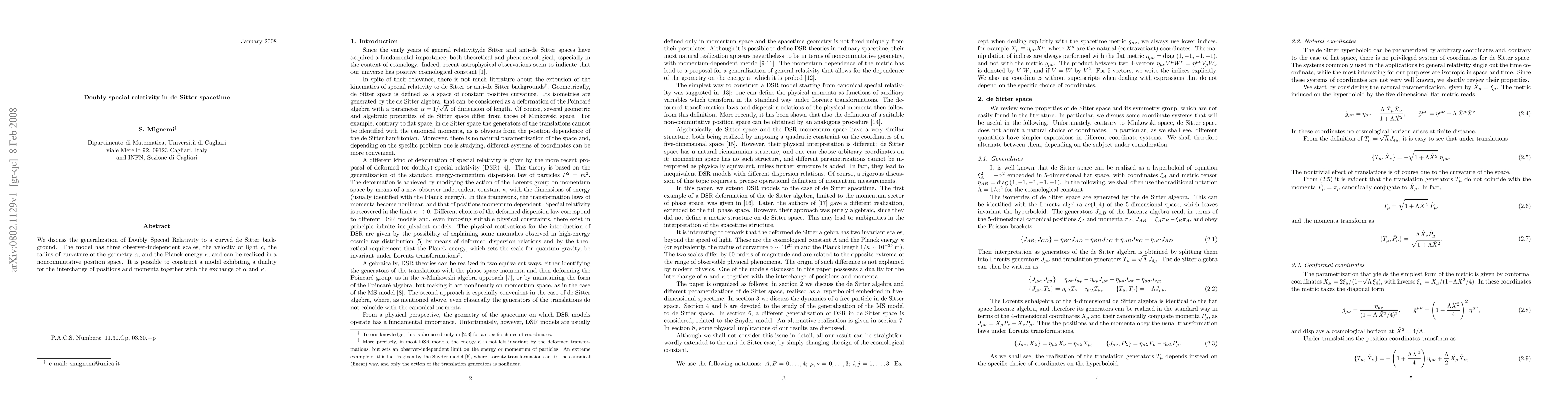 This paper generalizes Doubly Special Relativity to de Sitter spacetime, introducing three observer-independent scales: light speed $c$, curvature radius $\alpha$, and Planck energy $\kappa$. It proposes a noncommutative position space model with a duality exchanging positions and momenta while interchanging $\alpha$ and $\kappa$.