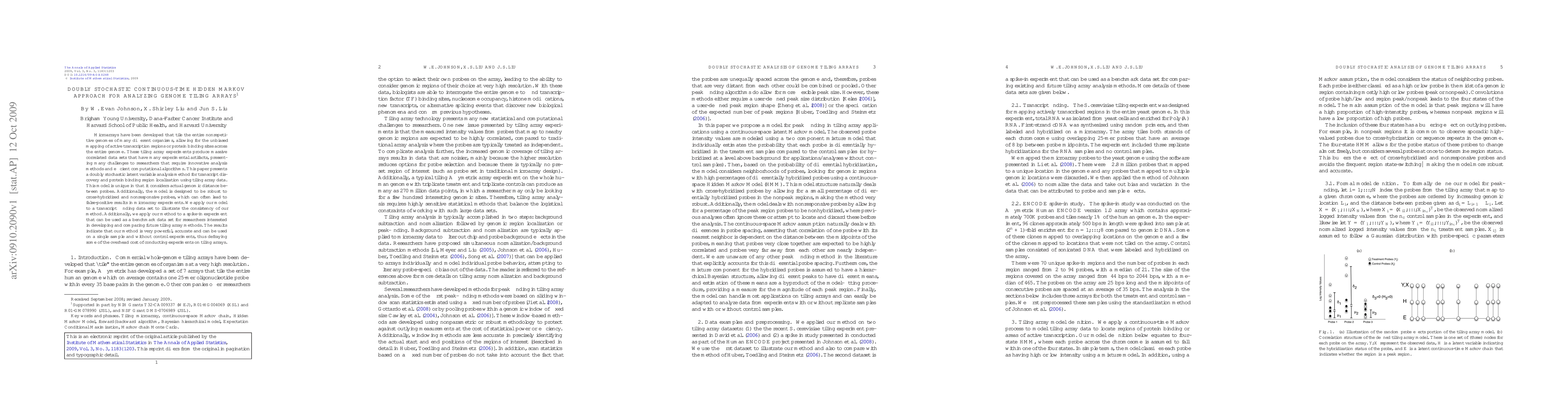 Microarrays have been developed that tile the entire nonrepetitive genomes of many different organisms, allowing for the unbiased mapping of active transcription regions or protein binding sites across the entire genome. These tiling array experiments produce massive correlated data sets that have many experimental artifacts, presenting many challenges to researchers that require innovative analysis methods and efficient computational algorithms. This paper presents a doubly stochastic latent variable analysis method for transcript discovery and protein binding region localization using tiling array data. This model is unique in that it considers actual genomic distance between probes. Additionally, the model is designed to be robust to cross-hybridized and nonresponsive probes, which can often lead to false-positive results in microarray experiments. We apply our model to a transcript finding data set to illustrate the consistency of our method. Additionally, we apply our method to a spike-in experiment that can be used as a benchmark data set for researchers interested in developing and comparing future tiling array methods. The results indicate that our method is very powerful, accurate and can be used on a single sample and without control experiments, thus defraying some of the overhead cost of conducting experiments on tiling arrays.