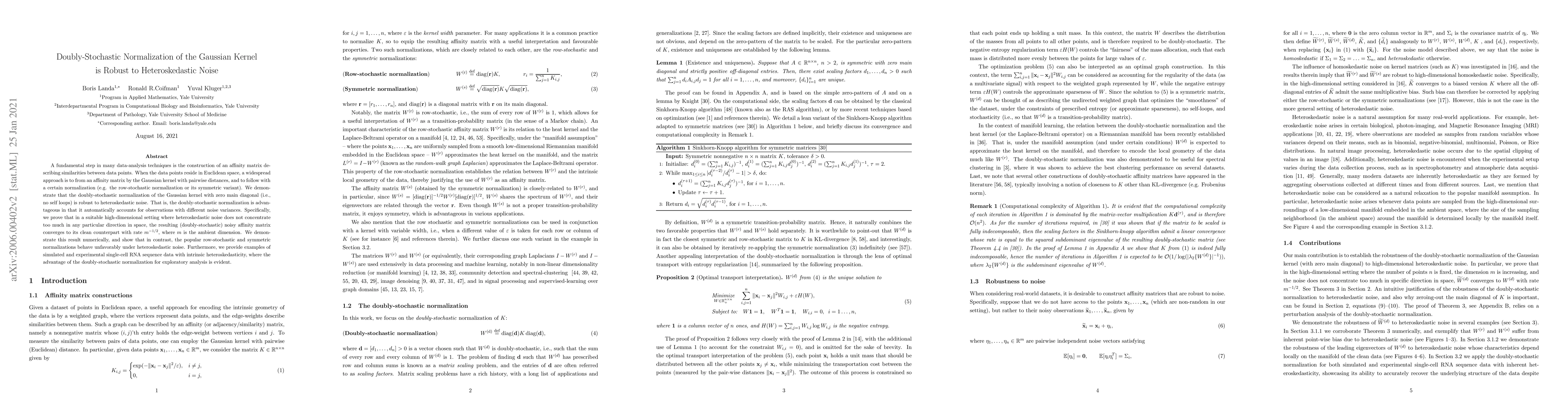 This paper demonstrates that doubly-stochastic normalization of the Gaussian kernel is robust to heteroskedastic noise, automatically accounting for varying noise variances across observations. It shows that this method converges to the clean affinity matrix in high dimensions, contrasting unfavorably with row-stochastic and symmetric normalizations under heteroskedastic conditions.