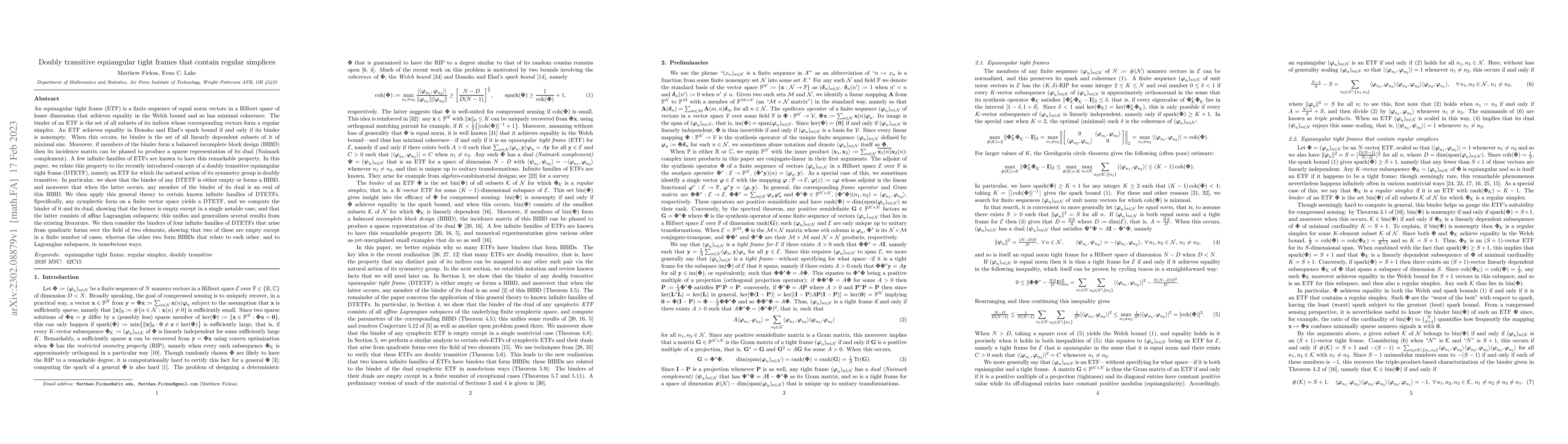 An equiangular tight frame (ETF) is a finite sequence of equal norm vectors in a Hilbert space of lesser dimension that achieves equality in the Welch bound and so has minimal coherence. The binder of an ETF is the set of all subsets of its indices whose corresponding vectors form a regular simplex. An ETF achieves equality in Donoho and Elad's spark bound if and only if its binder is nonempty. When this occurs, its binder is the set of all linearly dependent subsets of it of minimal size. Moreover, if members of the binder form a balanced incomplete block design (BIBD) then its incidence matrix can be phased to produce a sparse representation of its dual (Naimark complement). A few infinite families of ETFs are known to have this remarkable property. In this paper, we relate this property to the recently introduced concept of a doubly transitive equiangular tight frame (DTETF), namely an ETF for which the natural action of its symmetry group is doubly transitive. In particular, we show that the binder of any DTETF is either empty or forms a BIBD, and moreover that when the latter occurs, any member of the binder of its dual is an oval of this BIBD. We then apply this general theory to certain known infinite families of DTETFs. Specifically, any symplectic form on a finite vector space yields a DTETF, and we compute the binder of it and its dual, showing that the former is empty except in a single notable case, and that the latter consists of affine Lagrangian subspaces; this unifies and generalizes several results from the existing literature. We then consider the binders of four infinite families of DTETFs that arise from quadratic forms over the field of two elements, showing that two of these are empty except in a finite number of cases, whereas the other two form BIBDs that relate to each other, and to Lagrangian subspaces, in nonobvious ways.