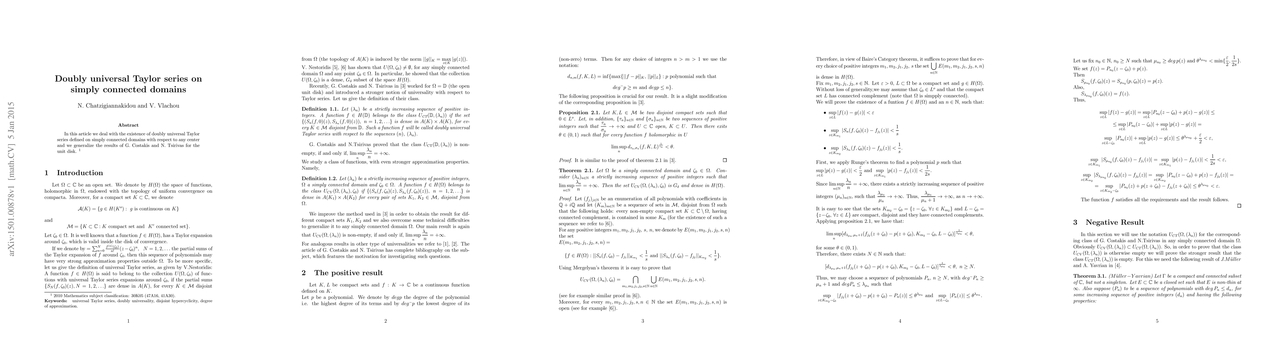 This paper explores the existence of doubly universal Taylor series on simply connected domains, extending previous findings by G. Costakis and N. Tsirivas specifically for the unit disk. The study generalizes these results to broader simply connected domains.