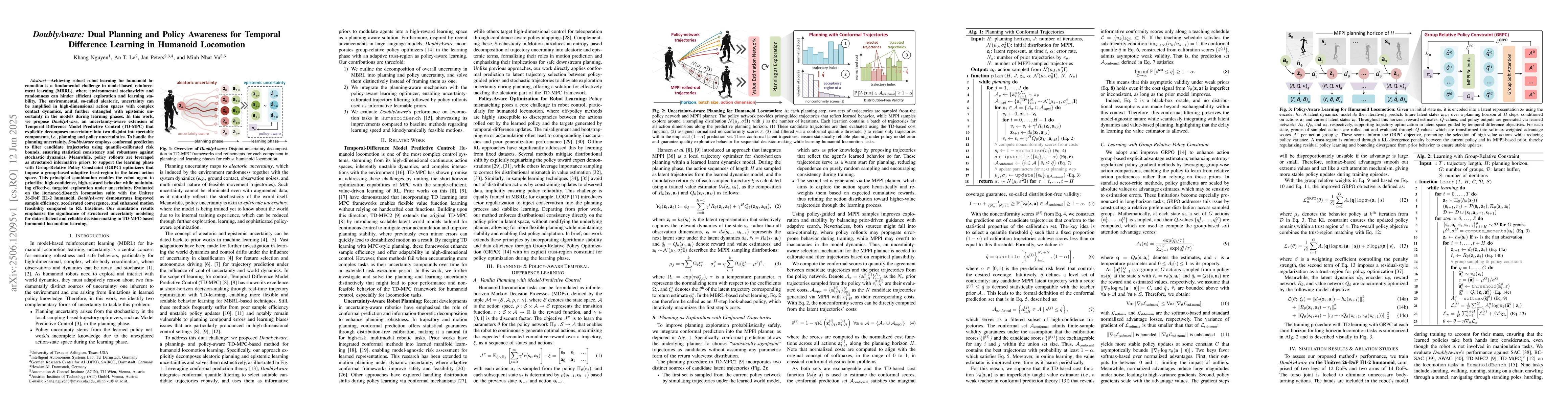 Achieving robust robot learning for humanoid locomotion is a fundamental challenge in model-based reinforcement learning (MBRL), where environmental stochasticity and randomness can hinder efficient exploration and learning stability. The environmental, so-called aleatoric, uncertainty can be amplified in high-dimensional action spaces with complex contact dynamics, and further entangled with epistemic uncertainty in the models during learning phases. In this work, we propose DoublyAware, an uncertainty-aware extension of Temporal Difference Model Predictive Control (TD-MPC) that explicitly decomposes uncertainty into two disjoint interpretable components, i.e., planning and policy uncertainties. To handle the planning uncertainty, DoublyAware employs conformal prediction to filter candidate trajectories using quantile-calibrated risk bounds, ensuring statistical consistency and robustness against stochastic dynamics. Meanwhile, policy rollouts are leveraged as structured informative priors to support the learning phase with Group-Relative Policy Constraint (GRPC) optimizers that impose a group-based adaptive trust-region in the latent action space. This principled combination enables the robot agent to prioritize high-confidence, high-reward behavior while maintaining effective, targeted exploration under uncertainty. Evaluated on the HumanoidBench locomotion suite with the Unitree 26-DoF H1-2 humanoid, DoublyAware demonstrates improved sample efficiency, accelerated convergence, and enhanced motion feasibility compared to RL baselines. Our simulation results emphasize the significance of structured uncertainty modeling for data-efficient and reliable decision-making in TD-MPC-based humanoid locomotion learning.