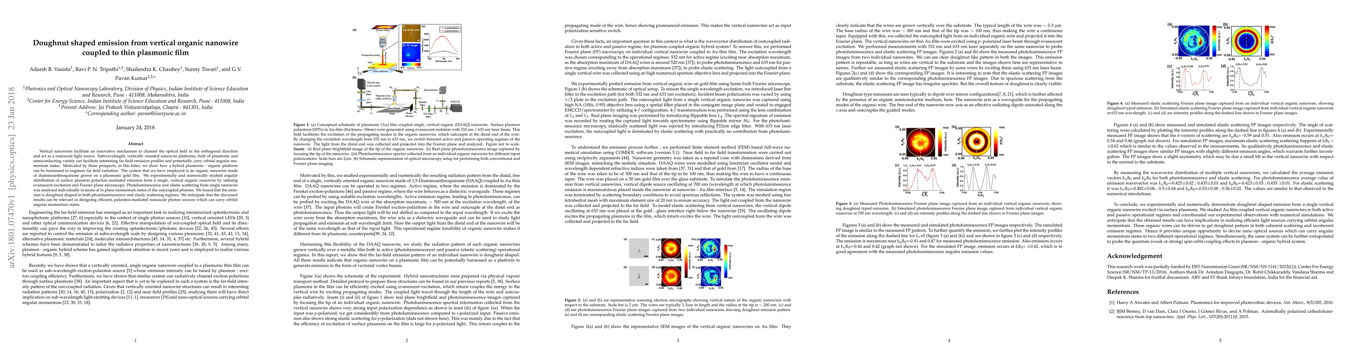 This paper demonstrates the use of a vertical organic nanowire on a plasmonic gold film to generate doughnut-shaped emission through surface plasmon polariton mediation. The study combines experimental and numerical analysis to show that the emission profile can carry orbital angular momentum states, potentially aiding in the design of efficient nanoscale photon sources.