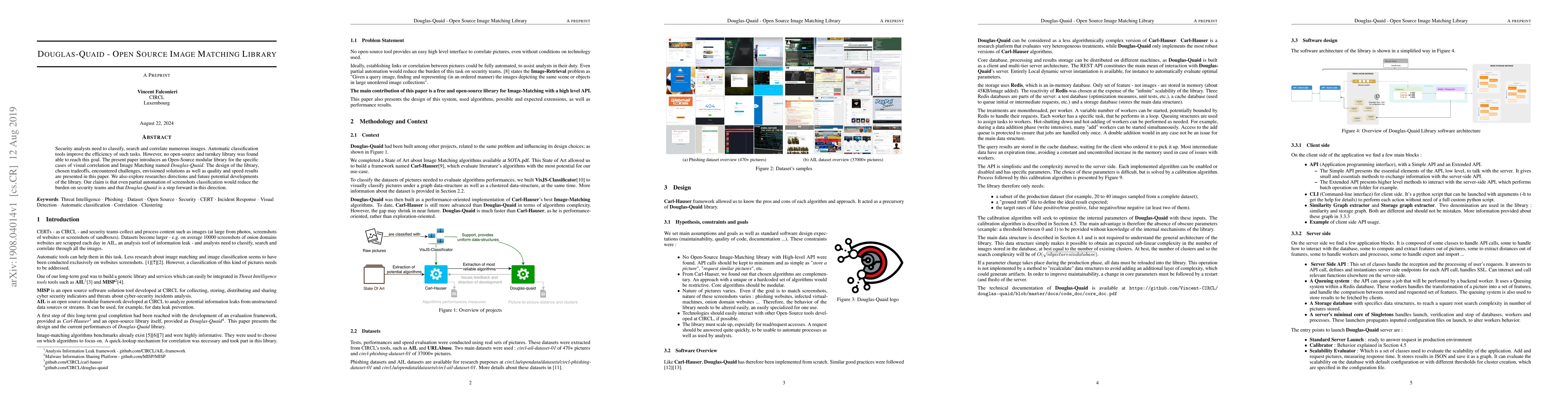 The paper introduces Douglas-Quaid, an open-source modular library for visual correlation and image matching, aiming to automate the classification and search of images for security analysts. The paper discusses the library's design, challenges, and performance, asserting its potential to alleviate the workload on security teams.