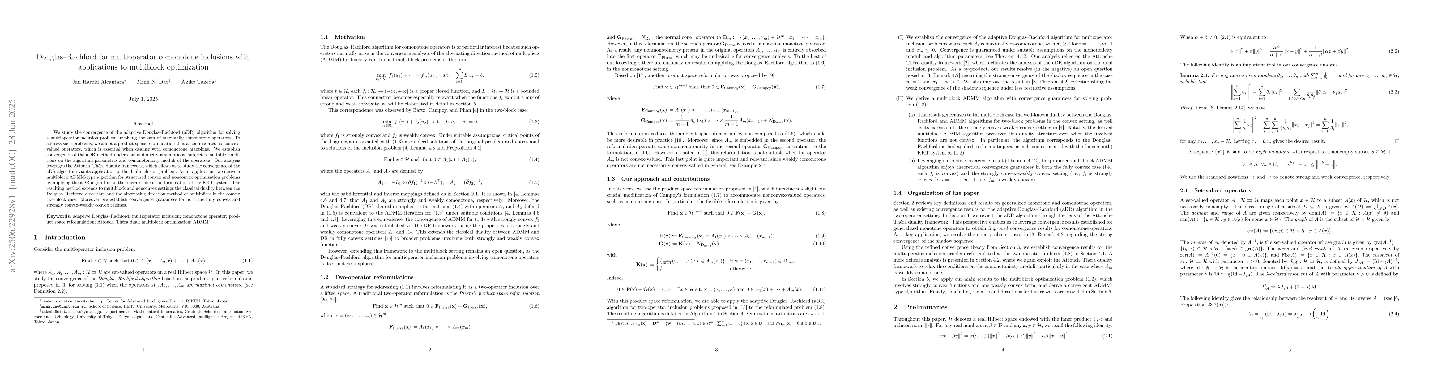 We study the convergence of the adaptive Douglas--Rachford (aDR) algorithm for solving a multioperator inclusion problem involving the sum of maximally comonotone operators. To address such problems, we adopt a product space reformulation that accommodates nonconvex-valued operators, which is essential when dealing with comonotone mappings. We establish convergence of the aDR method under comonotonicity assumptions, subject to suitable conditions on the algorithm parameters and comonotonicity moduli of the operators. Our analysis leverages the Attouch--Th\'{e}ra duality framework, which allows us to study the convergence of the aDR algorithm via its application to the dual inclusion problem. As an application, we derive a multiblock ADMM-type algorithm for structured convex and nonconvex optimization problems by applying the aDR algorithm to the operator inclusion formulation of the KKT system. The resulting method extends to multiblock and nonconvex settings the classical duality between the Douglas--Rachford algorithm and the alternating direction method of multipliers in the convex two-block case. Moreover, we establish convergence guarantees for both the fully convex and strongly convex-weakly convex regimes.