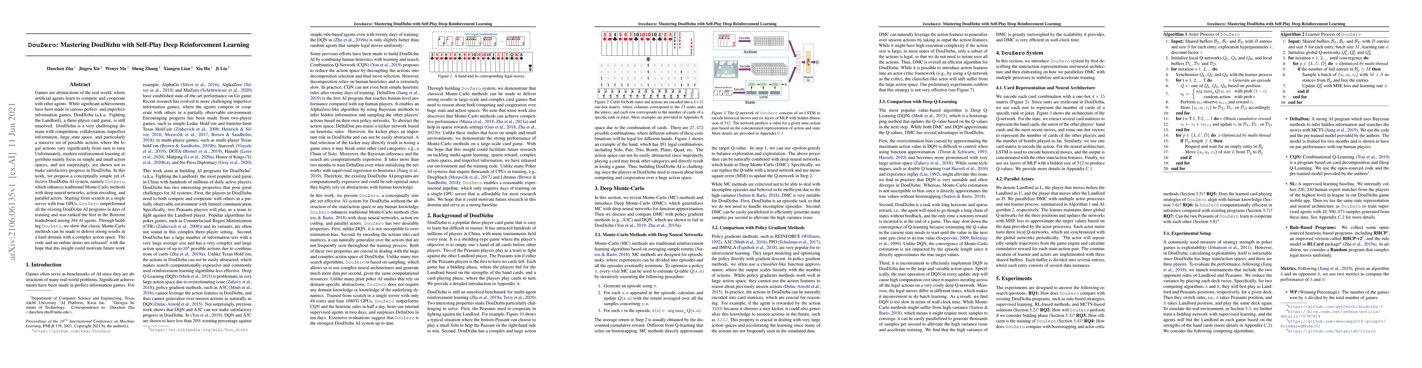 Researchers created DouZero, a self-play deep reinforcement learning AI that outperformed existing systems in the challenging card game DouDizhu, demonstrating that classic Monte-Carlo methods can succeed in complex domains with large action spaces.