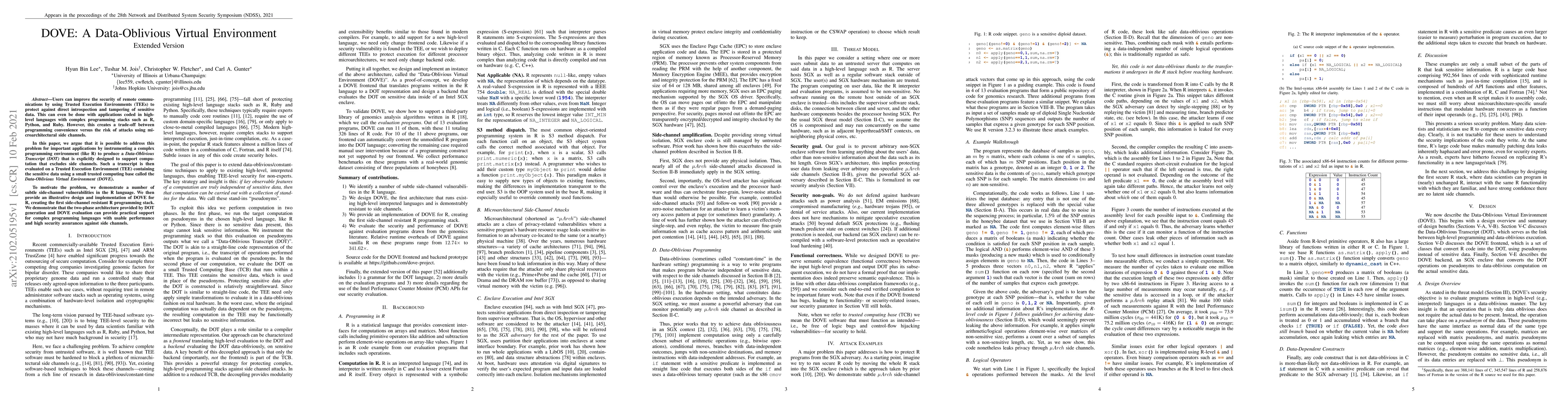 Users can improve the security of remote communications by using Trusted Execution Environments (TEEs) to protect against direct introspection and tampering of sensitive data. This can even be done with applications coded in high-level languages with complex programming stacks such as R, Python, and Ruby. However, this creates a trade-off between programming convenience versus the risk of attacks using microarchitectural side channels. In this paper, we argue that it is possible to address this problem for important applications by instrumenting a complex programming environment (like R) to produce a Data-Oblivious Transcript (DOT) that is explicitly designed to support computation that excludes side channels. Such a transcript is then evaluated on a Trusted Execution Environment (TEE) containing the sensitive data using a small trusted computing base called the Data-Oblivious Virtual Environment (DOVE). To motivate the problem, we demonstrate a number of subtle side-channel vulnerabilities in the R language. We then provide an illustrative design and implementation of DOVE for R, creating the first side-channel resistant R programming stack. We demonstrate that the two-phase architecture provided by DOT generation and DOVE evaluation can provide practical support for complex programming languages with usable performance and high security assurances against side channels.